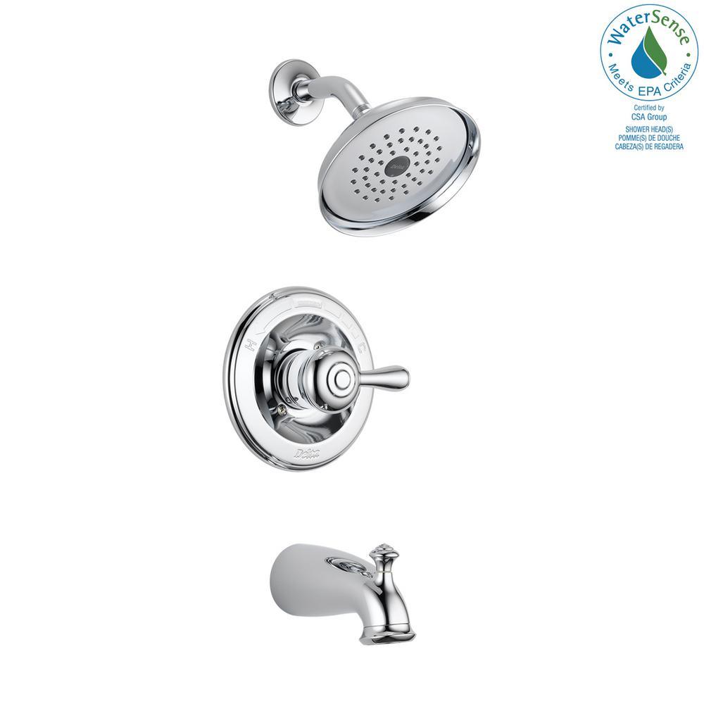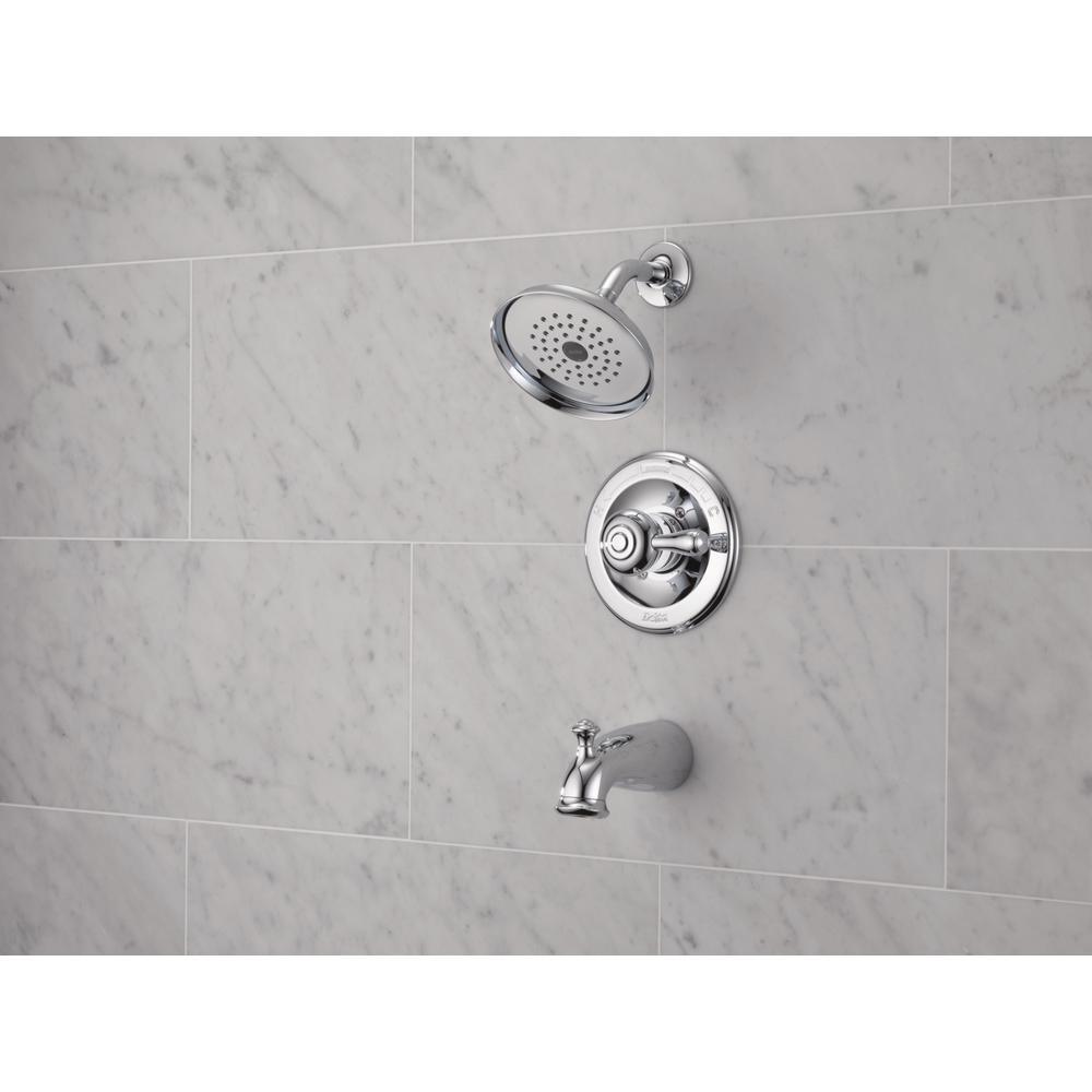 This Leland 1-Handle Tub and Shower Faucet in Chrome is a wonderful addition to your bathroom and complements many decor styles. Delta is committed to supporting water conservation around the globe and has been recognized as WaterSense Manufacturer Partner of the Year in 2011, 2013, and 2014. Monitor faucets feature exclusive pressure balance valves to keep water temperature within a safe ±3.6° F (±1.7° C), protecting you from sudden changes in hot or cold water pressure. Monitor valves also feature an adjustable high-temperature limit stop that, when properly, set helps ensure the handle cannot be turned to a position that is too hot for comfort.