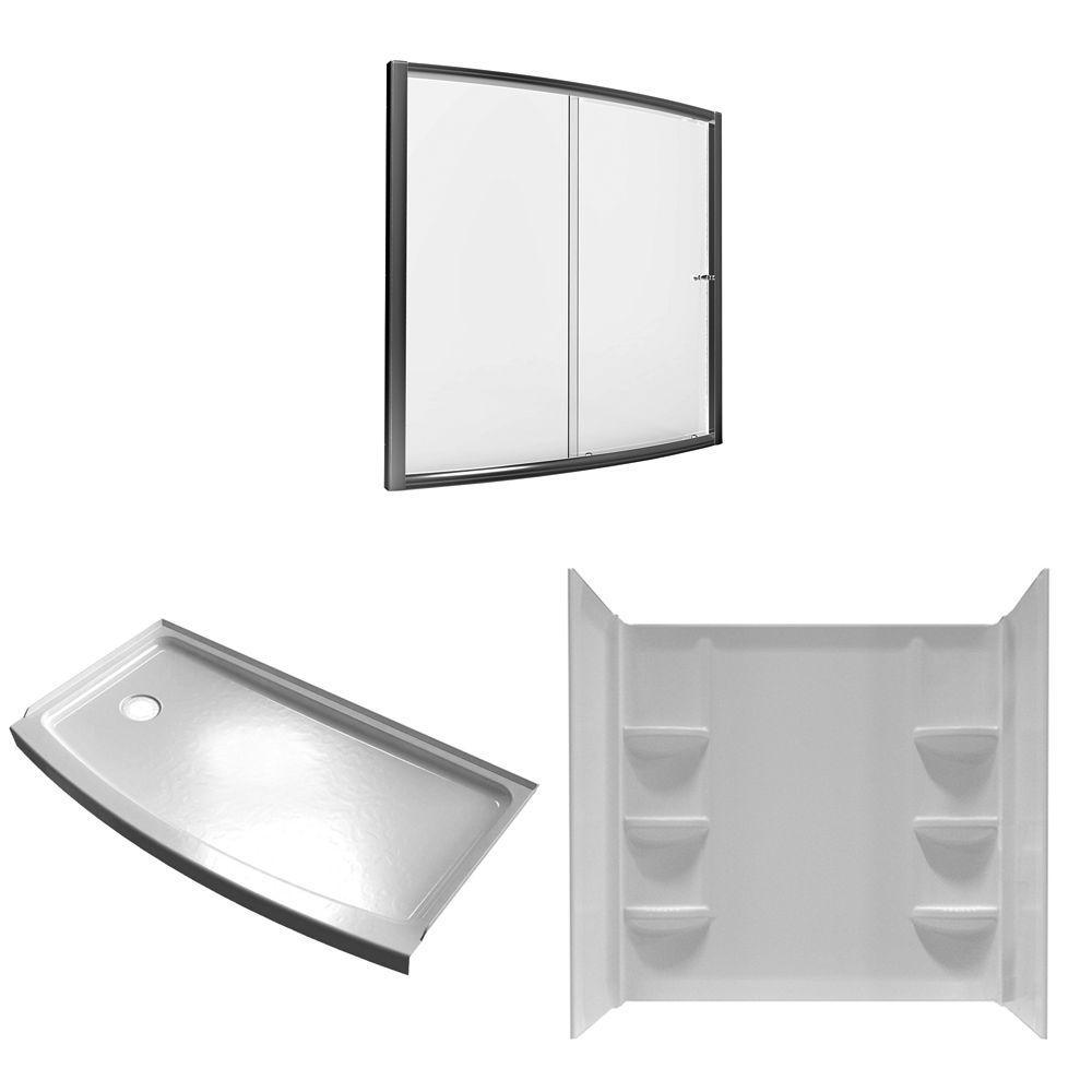 - Items included: Ovation shower door, curved low threshold shower base and 3 piece wall set