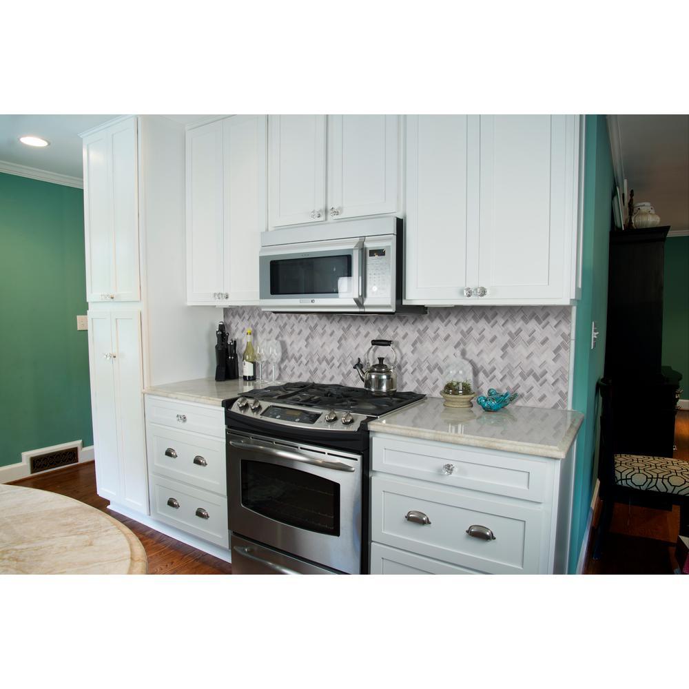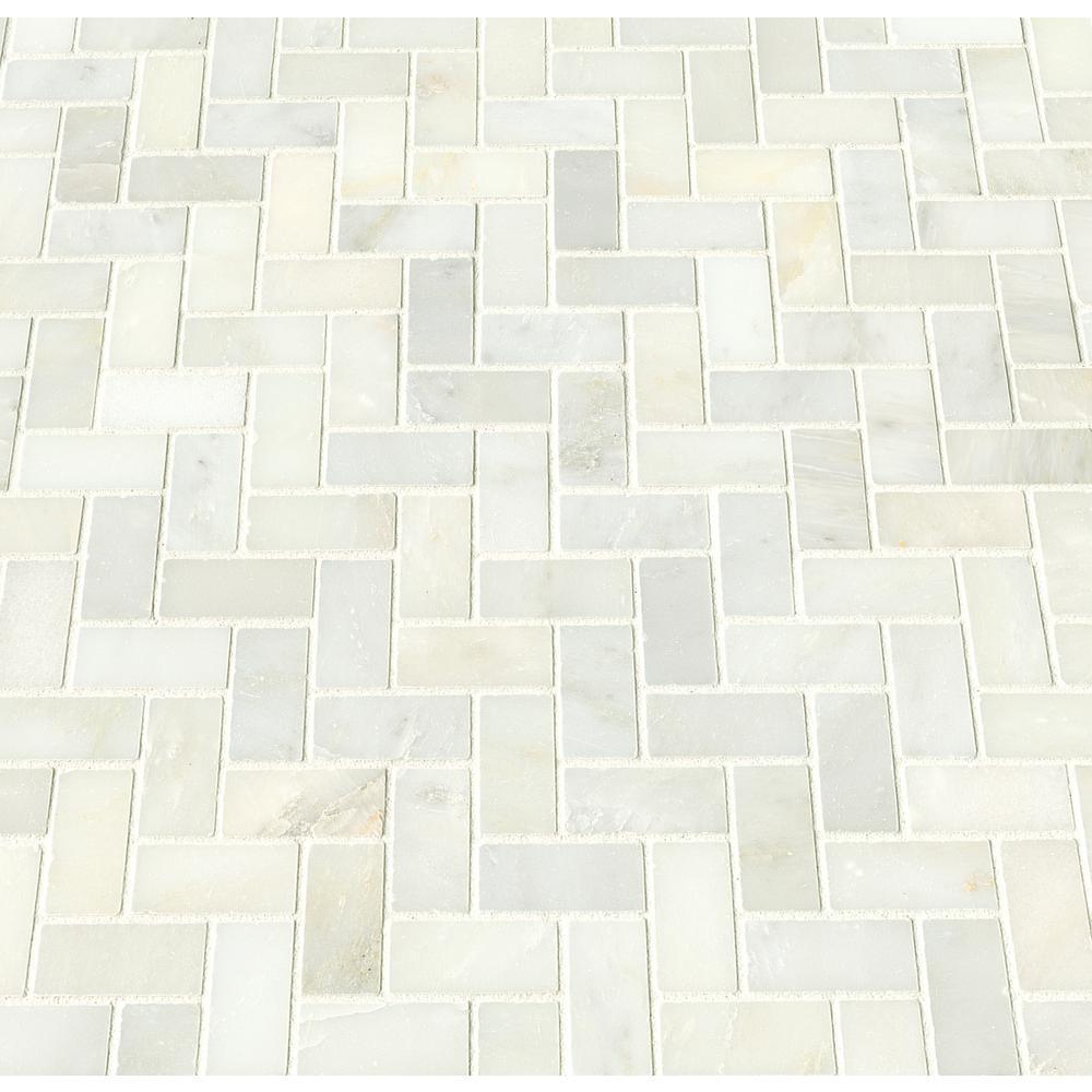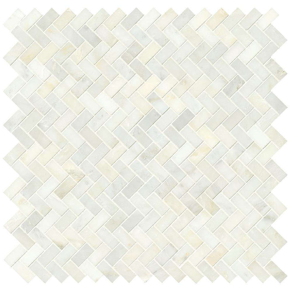 Add a splash of contemporary style to your decor with this 12 in. x 12 in. x 10 mm. polished marble mesh-mounted mosaic floor and wall tile. This Grade 1 tile lends a unique, arabesque pattern to your floors, walls and countertops. The attractive tile-pieces are sized on a mesh sheet for easy installation in your residential or commercial expanse. This flooring option is designed with elegant white shades and durable flair; it features chips of natural marble in a herringbone pattern. Natural stone products inherently vary in color, shade and finish, so it is recommended to blend tiles from different boxes when installing. Seal all-natural stone with a penetrating sealer. Offering supreme style and strength, the impervious, frost-resistant tile absorbs less than 0.5 percent of water. Included per case are 10-pieces. Note: Inspect all tiles before installation. Natural stone products inherently lack uniformity and are subject to variation in color, shade, finish etc. It is recommended to blend tiles from different boxes when installing. Natural stones may be characterized by dry seams and pits that are often filled. The filling can work its way out and it may be necessary to refill these voids as part of a normal maintenance procedure. All natural stone products should be sealed with a penetrating sealer.
