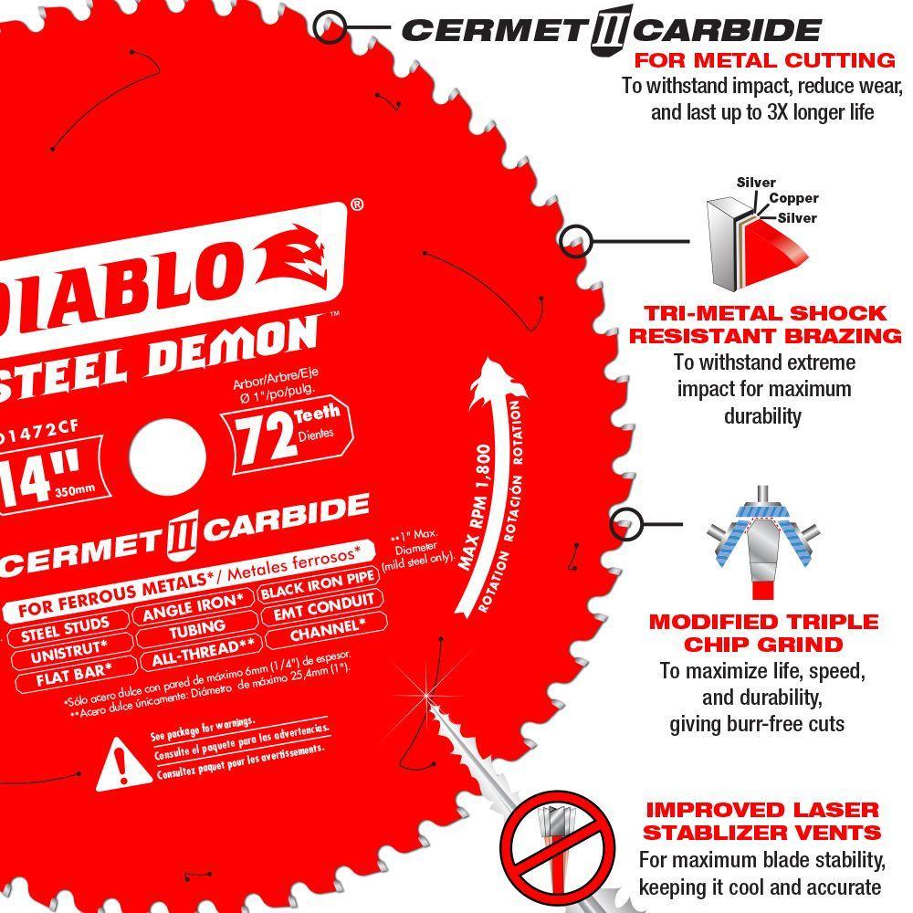 Diablo’s new Steel Demon 14 in. 72-Teeth per in. Cermet circular saw blades deliver 3X the life of a standard carbide-tipped blade in metal cutting applications. This blade features new, exclusive innovation with a special Triple Chip grind and Perma-SHIELD coating to provide maximum cutting life in a wide variety of ferrous metals.