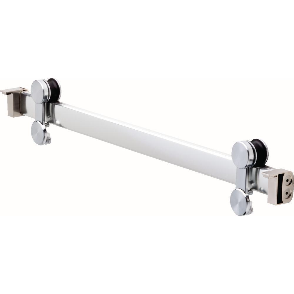 Sleek, minimalistic top track features a modern barn door design with exposed rollers and slim metal side trim pieces for an open, contemporary look