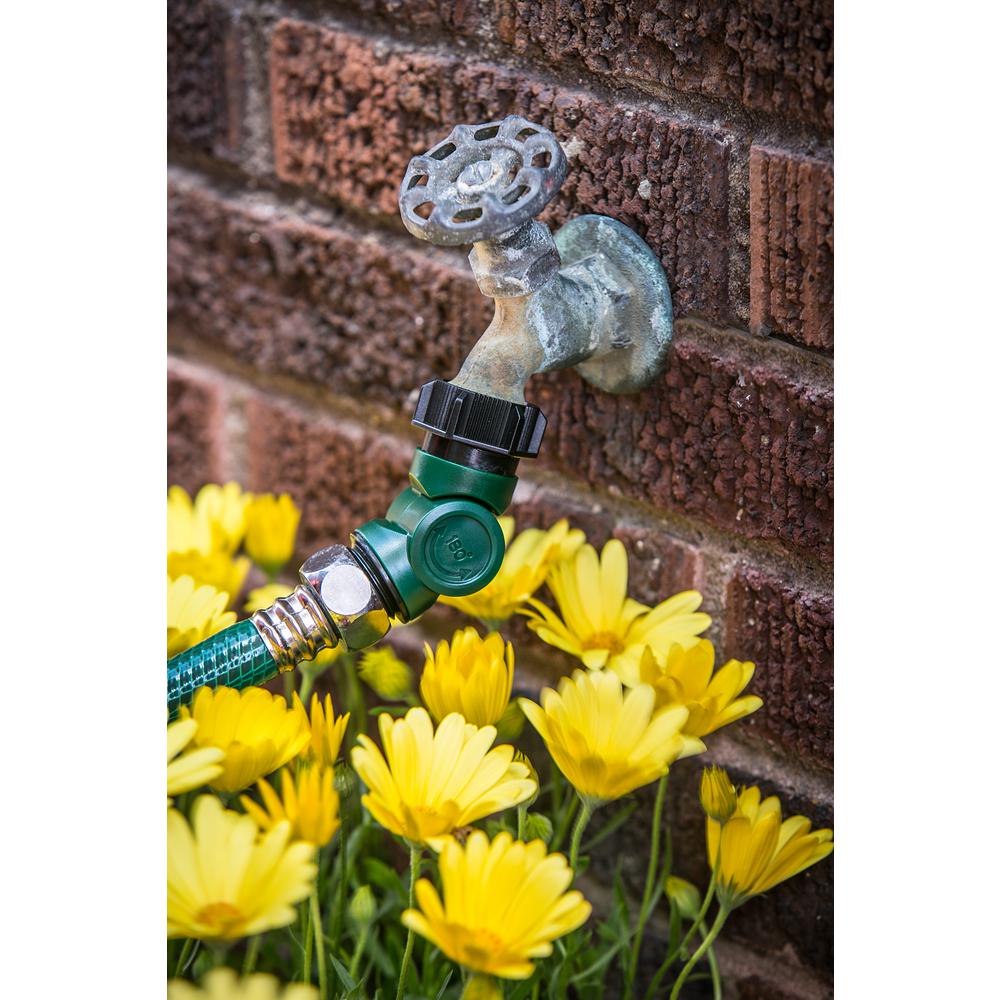 The unique Melnor Swivel Hose Connector allows full movement of the garden hose while preventing hose kinks. The connector pivots and swivels on two axes to prevent binding. The durable construction designed to be attached to the faucet all season.