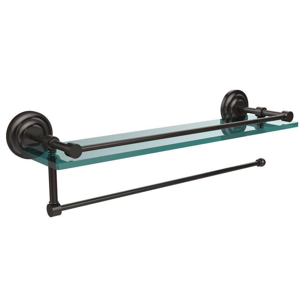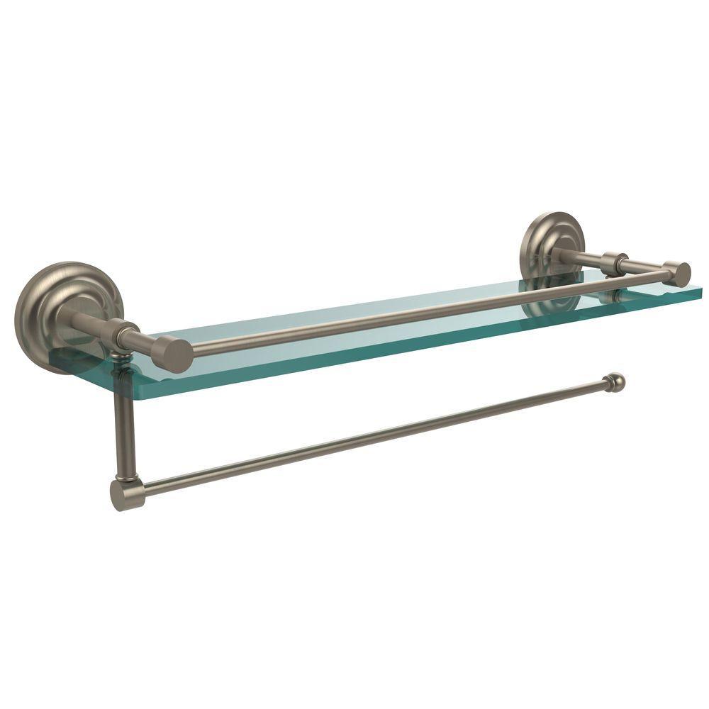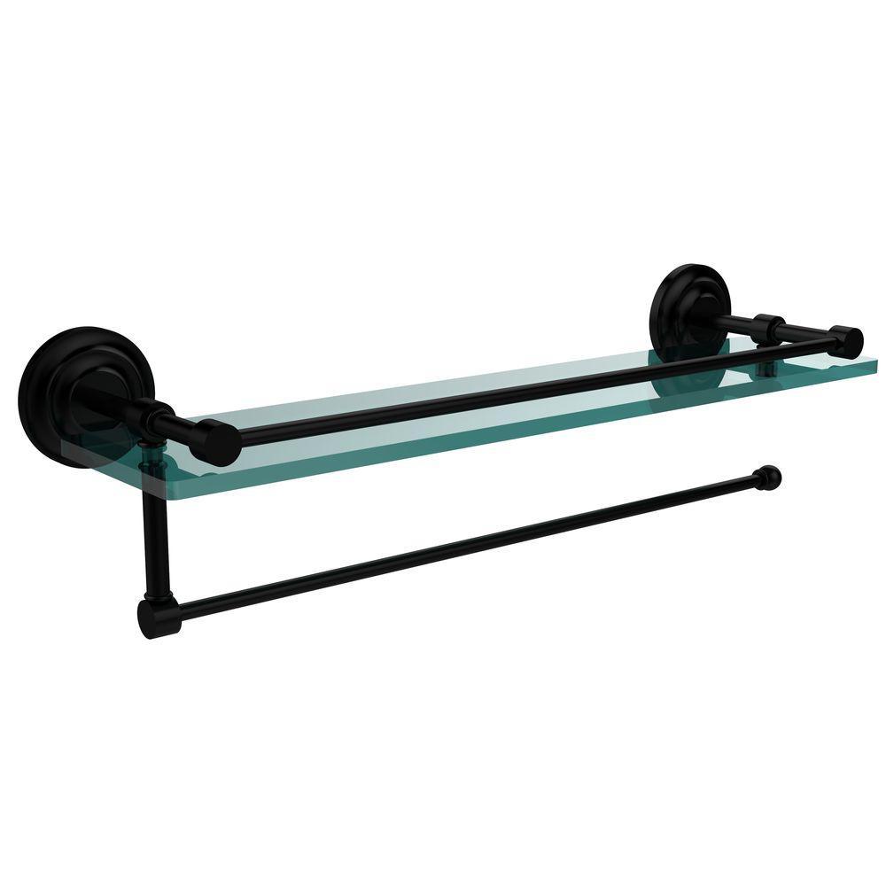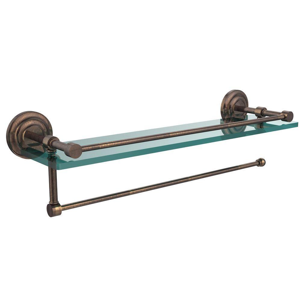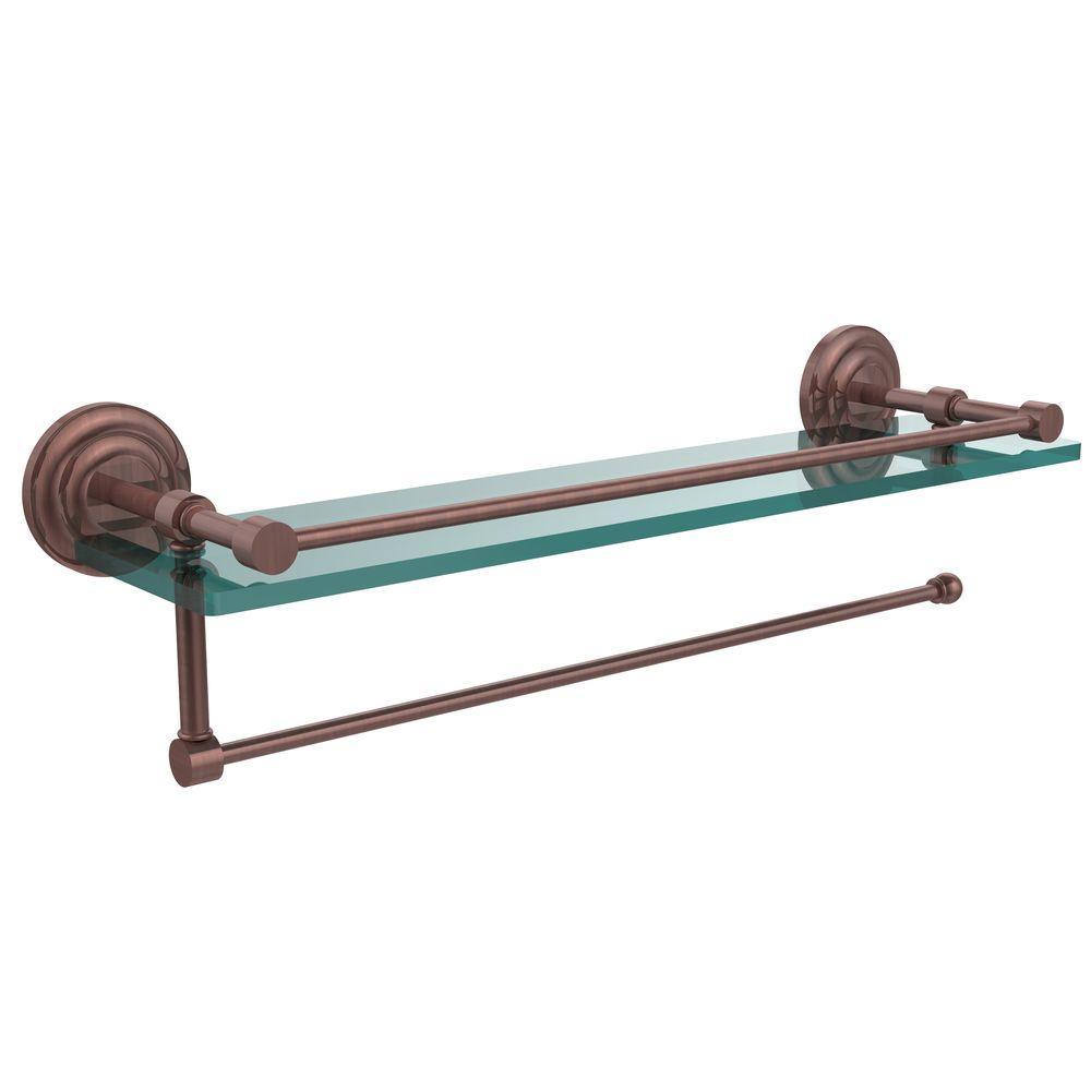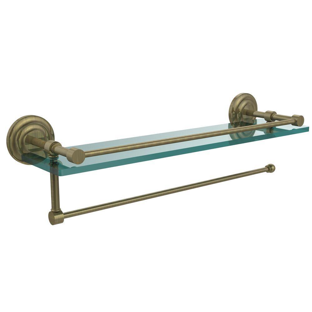 Maximize space and efficiency with this beautiful glass shelf and paper towel holder combination. Gallery rail will keep your items secure while the integrated paper towel holder provides a creative space for your roll. Large or regular sized rolls of paper towel will work with this convenient space saving paper towel holder. Practical design makes great use of wall space and provides ideal shelf space for all your favorite items. Made of solid brass and tempered glass this classic unit will enhance any kitchen.