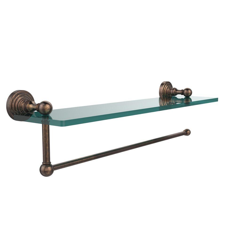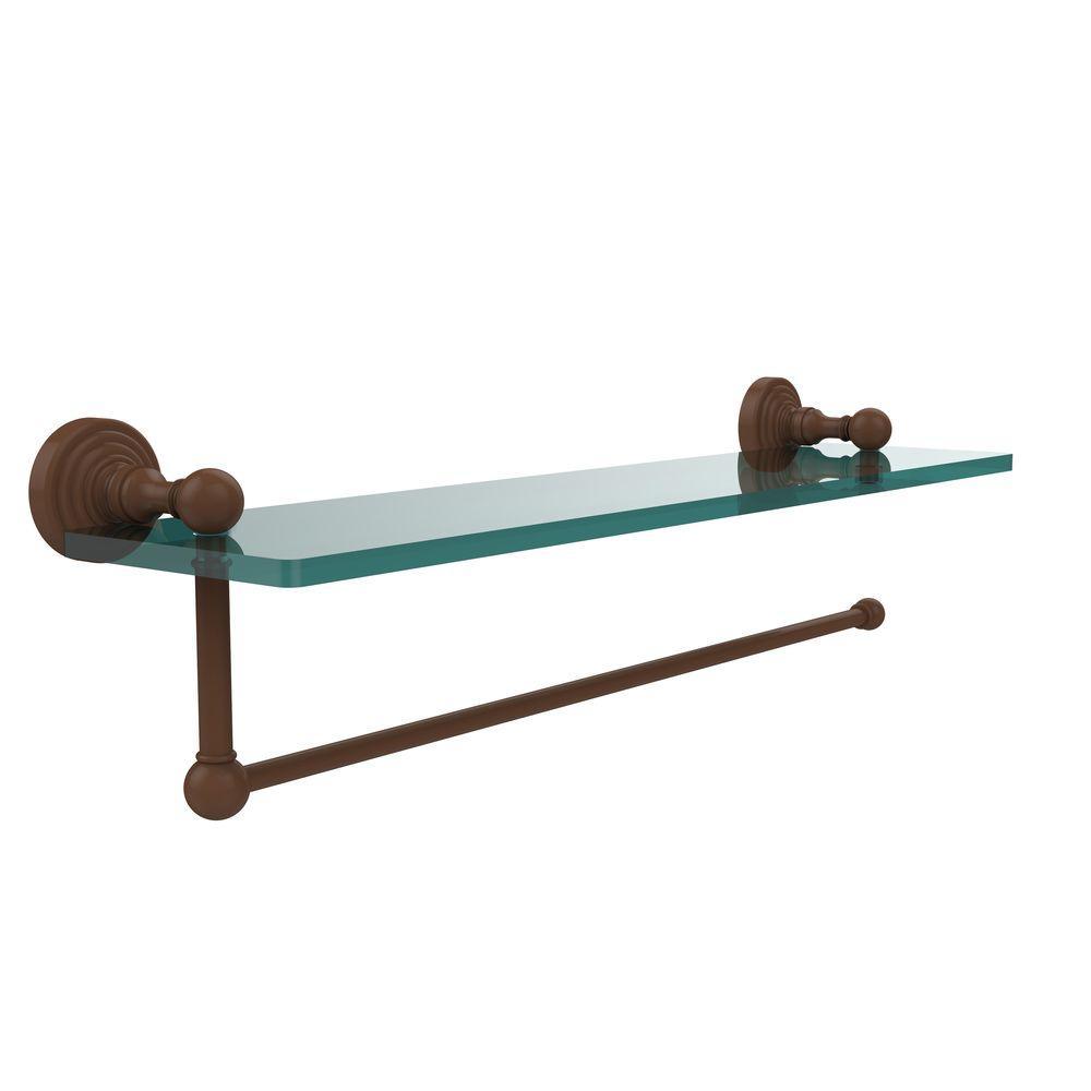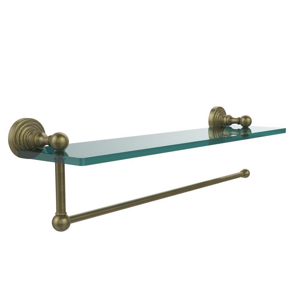 Maximize space and efficiency with this beautiful glass shelf and paper towel holder combination. Large or regular sized rolls of paper towel will work with this convenient space saving paper towel holder. Practical design makes great use of wall space and provides ideal shelf space for all your favorite items. Made of solid brass and tempered glass this classic unit will enhance any kitchen.