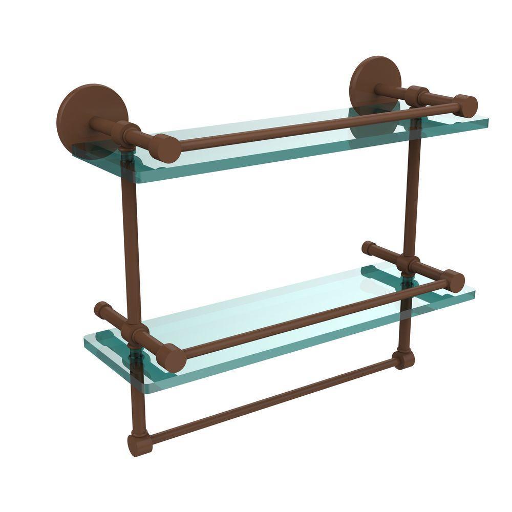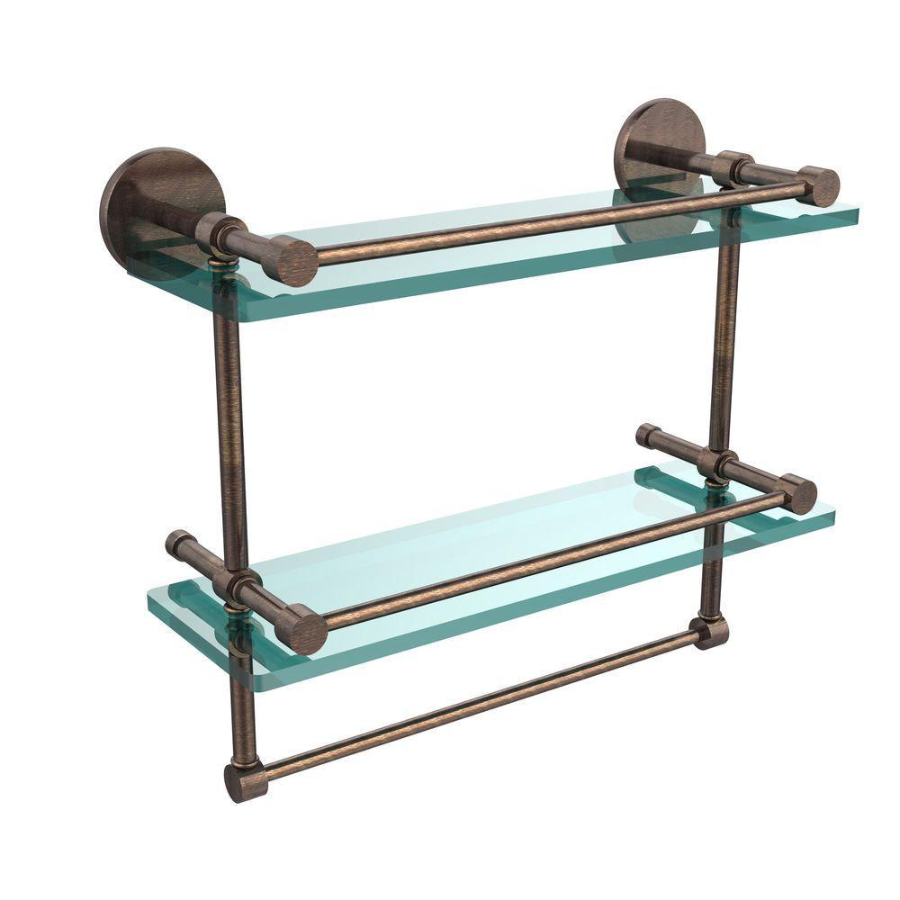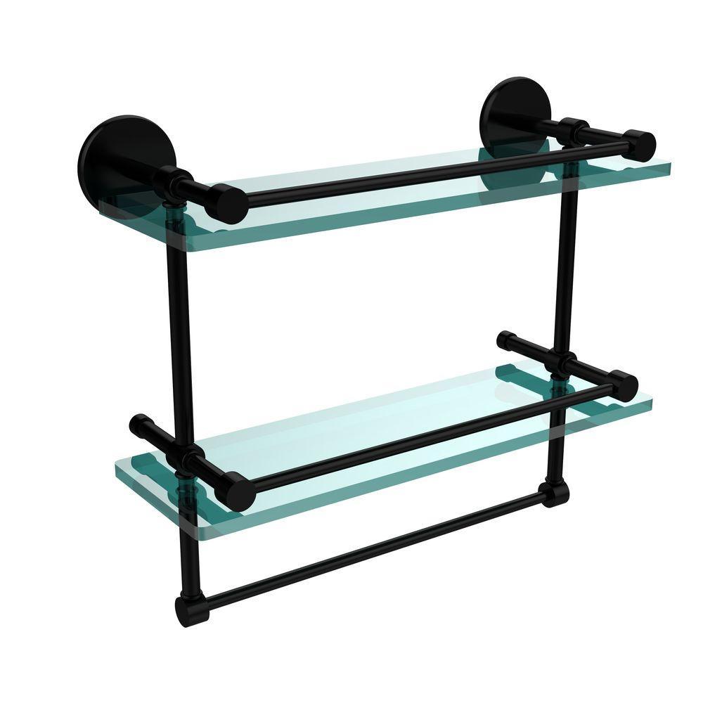 16 in. L x 12 in. H x 5 in. W 2-Tier Gallery Clear Glass Bathroom Shelf with Towel Bar in Matte Black