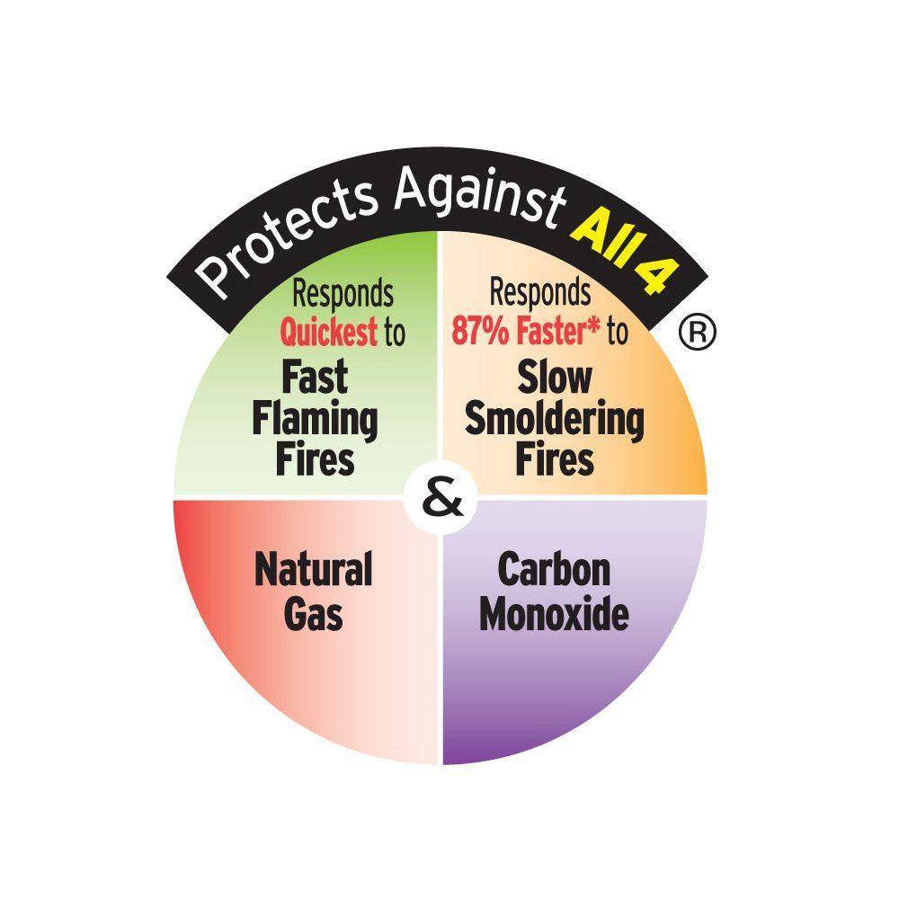 The Universal Security Instruments Hardwired IoPhic Smart Alarm is a 4-in-1 device that provides quadruple the protection with a single installation. This 120-volt AC alarm protects against four deadly household threats: fast-flaming fires, smoldering smoke, carbon monoxide and natural gas (or methane). Perfect for new or replacement installations, the alarm is suitable for houses, apartments and mobile homes. IoPhic Universal Sensing Technology responds 87% faster to slow smoldering fires and responds quickest to fast-flaming fires. Auto sensitivity calibration provides superior nuisance alarm protection and creates consistency in alarm sensitivity. This alarm has additional automatic features including a self-diagnostics check to ensure proper operation, a sensitivity adjustment for changes in temperature or humidity and an end-of-service life warning that sounds when it's time to replace the battery. The 9-volt alkaline battery (included) continues protection in the event of a power outage. This alarm features a front-loading battery drawer for replacing the battery without removing the alarm from the bracket. Mount the bracket to any standard wiring junction box and use the large mounting base to cover imperfections in drywall. For maximum protection, install an alarm inside every bedroom, outside every sleeping area and on all levels of the dwelling.