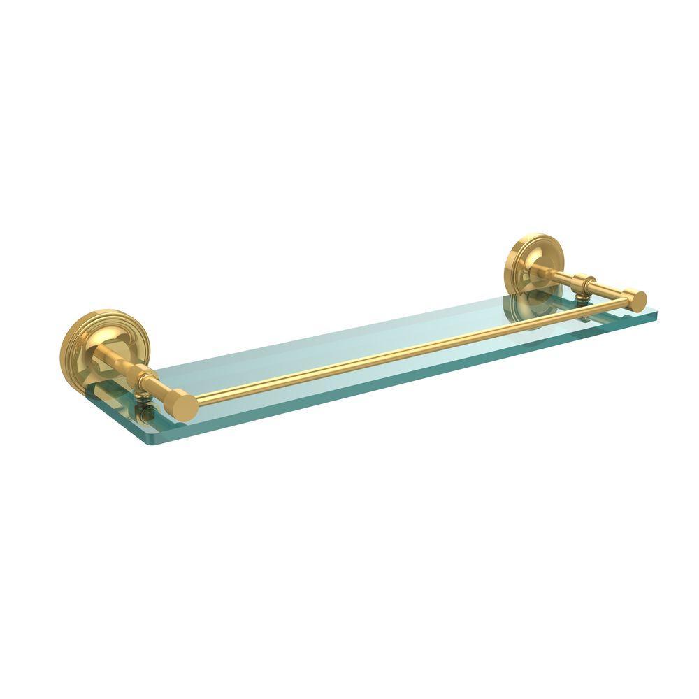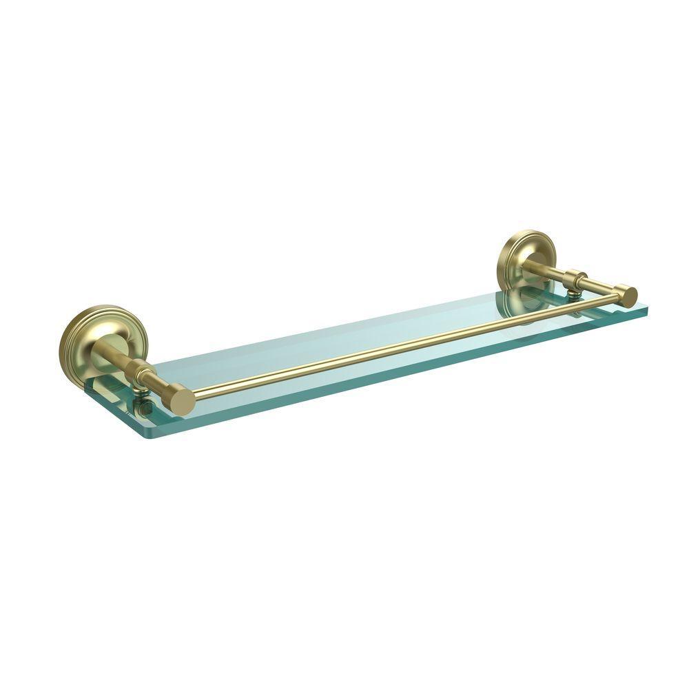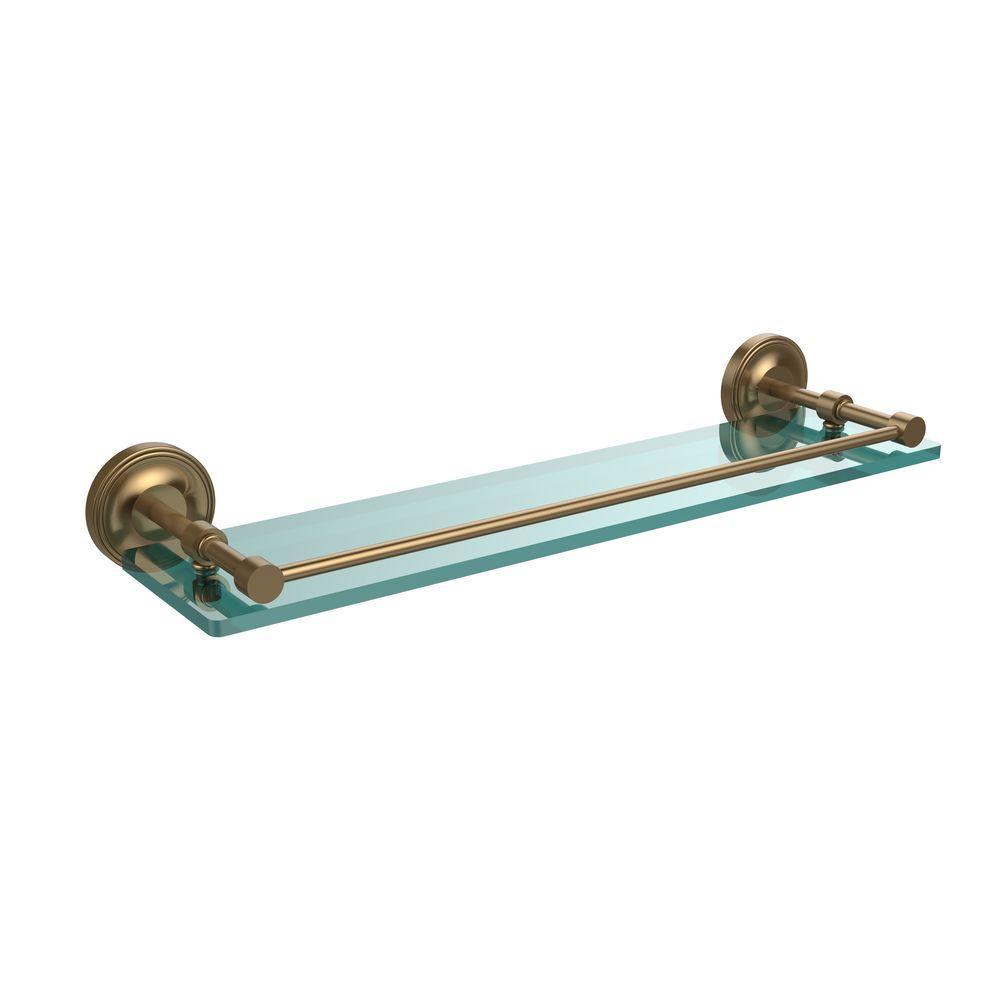 The Prestige Regal 22 in. L x 3 in. H x 5 in. W Clear Glass Bathroom Shelf with Gallery Rail has a sleek design and suits a wide range of decor options. Its tempered beveled-edged glass and sturdy brass construction provide long-lasting durability. The polished chrome finish of the shelf adds a touch of elegance to your bath space and helps repel staining and corrosion from water. This bathroom shelf comes with all the hardware required for mounting and installation.