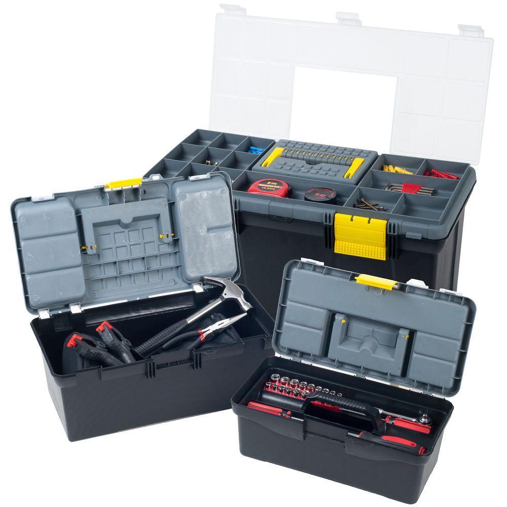 3 complete tool boxes in this set provide you with the perfect size tool box for every job. Each tool box features Top-of-Lid storage compartments and a removable tray, making it easier to carry around the tools you need on the job site, rather than the entire tool box. The built in pad-lock eye is perfect for security and keeping dangerous tools out of reach of small children.