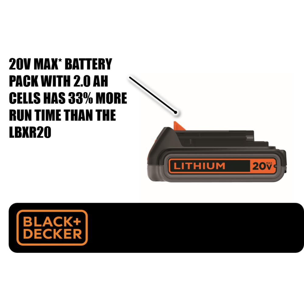 Keep your BLACK and DECKER tools running with an extra LBXR2020 battery pack. This Battery Pack with 2.0 ah cells have 33 % more run time than the BLACK and DECKER LBXR20 battery pack. If you need a new or extra battery, upgrade to the longer run time of this pack.