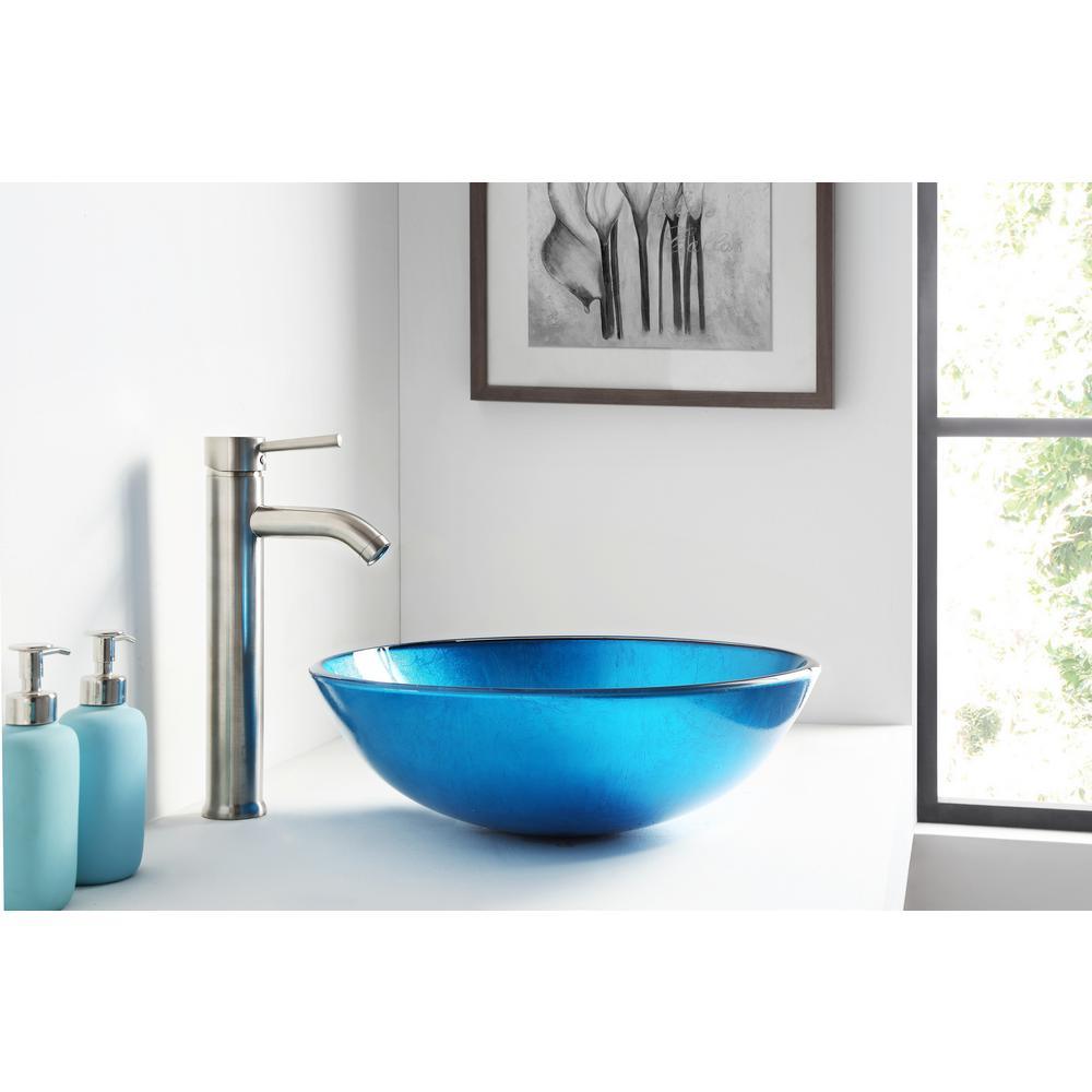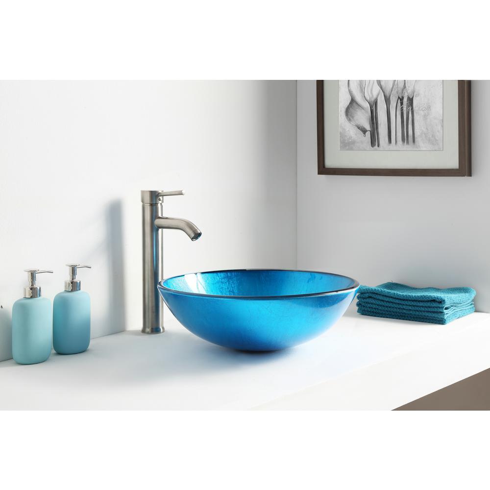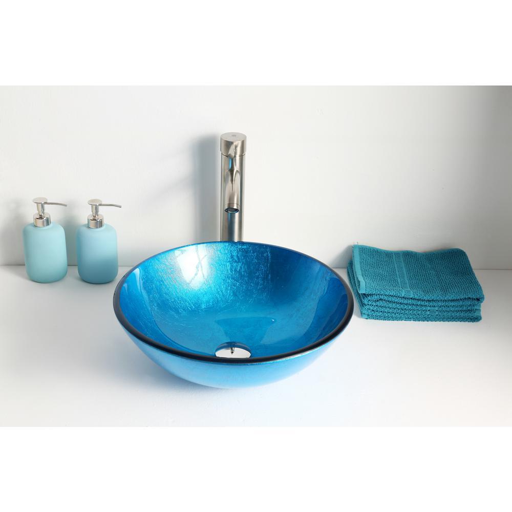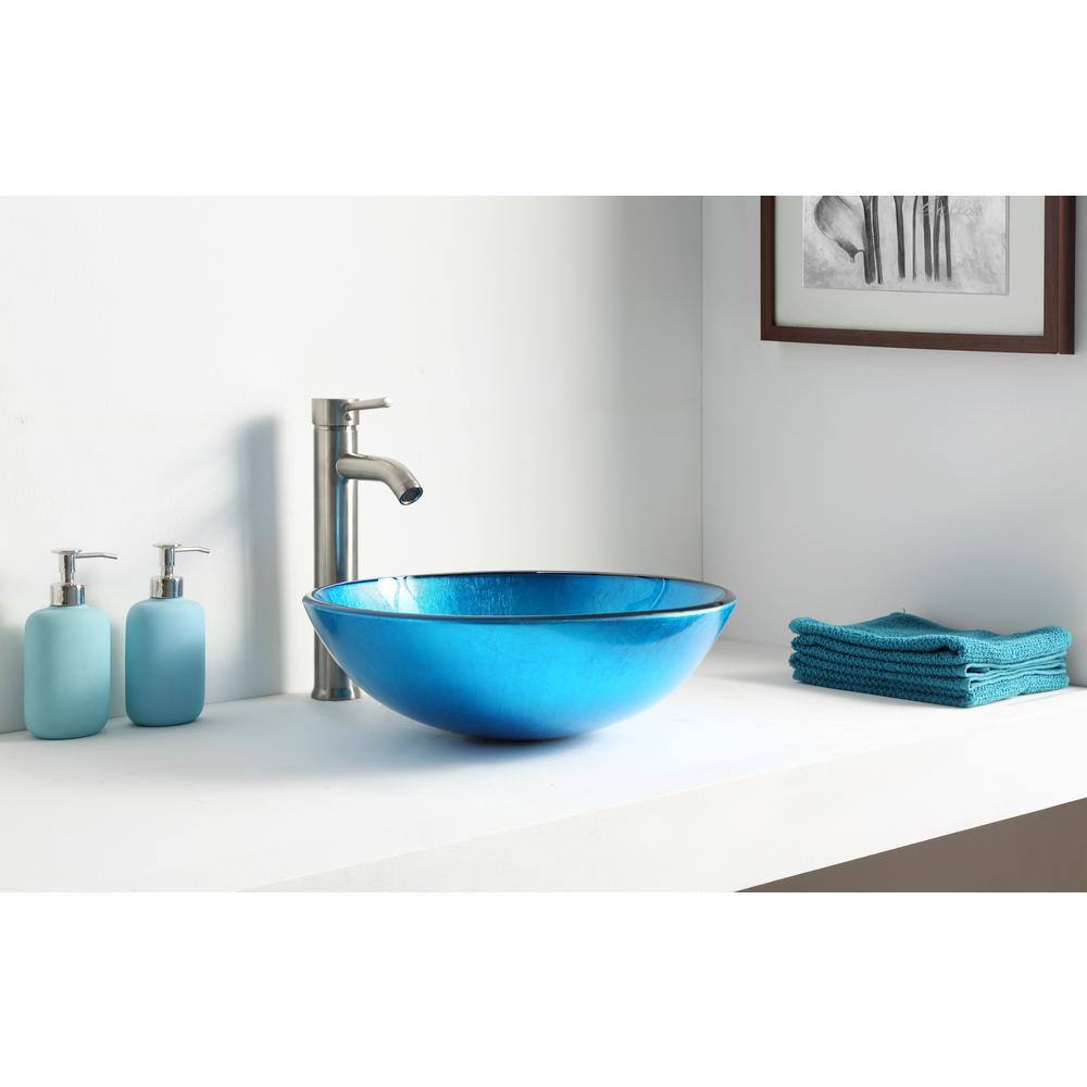 The ANZZI Arc Series sink is a traditionally crafted round vessel sink adorned in a Lustrous Light Blue Finish. Each ANZZI vessel sink if formed using Rhino Alloy certified high tempered Deco-Glass material. The result is a perfectly shaped dynamically captivating vessel centerpiece for any bathroom counter.