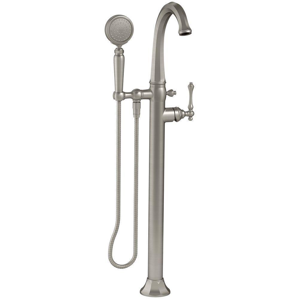 This Kelston Floor Mount Bath Filler features a traditional design that is a perfect complement to freestanding baths. The brushed nickel finish is sure to compliment any bathroom decor. Includes a single-lever handle that allows for both on and off activation. No mounting block included.