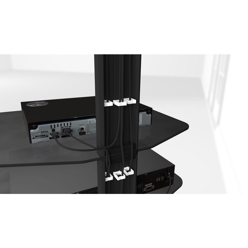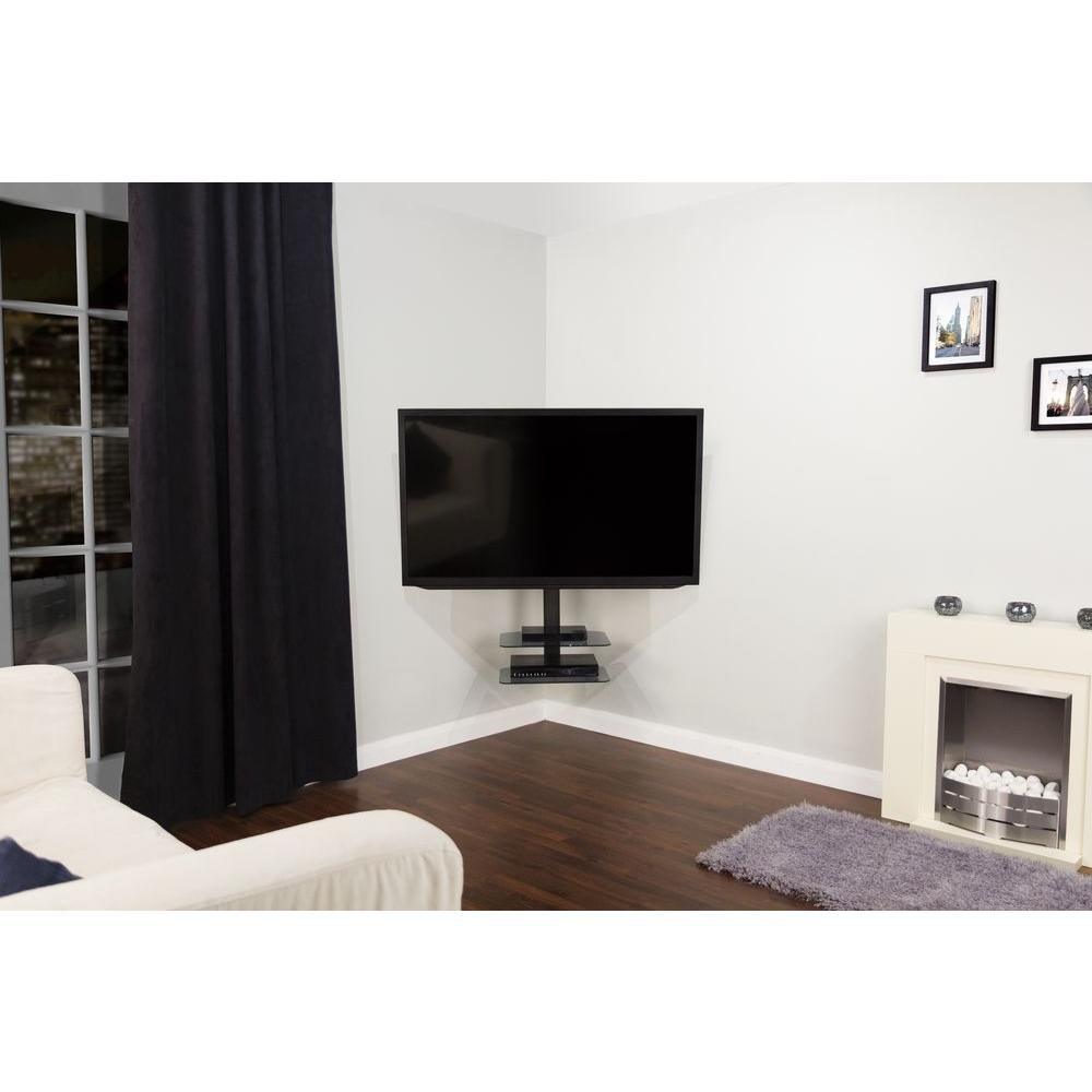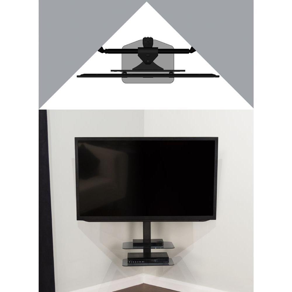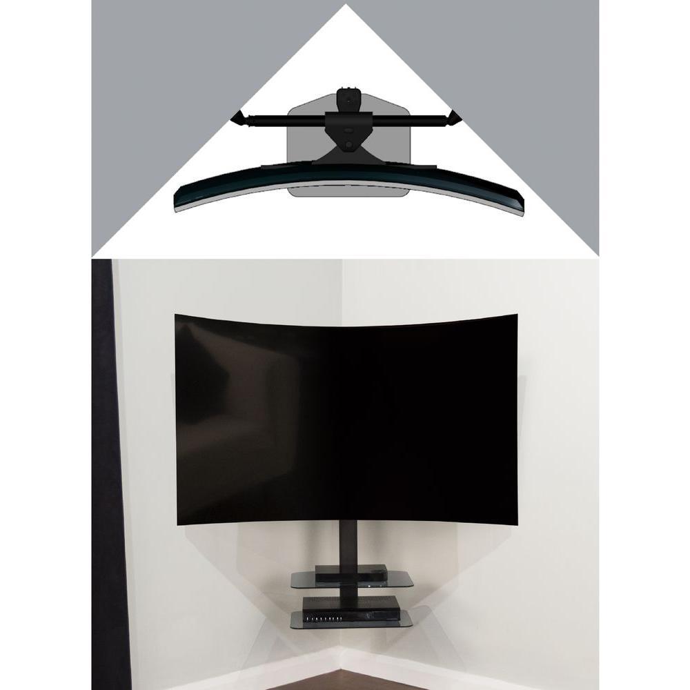 Achieve an open and uncluttered look in your living room by wall mounting your TV and its peripheral devices, with the NEW ‘floating’ Cornermount from AVF. AVF Cornermount is the perfect choice for mounting both curved and flat TVs. This unique, space-efficient all-in-one system looks great in use and can position TVs closer into corners than other wall mounting solutions. The ultra-secure 2-wall fixing method means Cornermount is super strong and can safely hold TVs up to 70 in., along with DVD or Blu-Ray players, Digital TV Receivers or Games Consoles on the 2 floating shelves below. Once on the wall, the TV can be tilted to avoid screen glare, smoothly slid laterally and turned as 1 unit with the shelving. This is great for perfecting viewing angles and means infrared remote receivers on all devices, always face the viewer. Shelving positioning is height adjustable and depending on your needs, you can set the Cornermount up with 1, 2 or no shelves at all. Cables can be hidden and channeled away behind the unit, for a tidy finish. With the supplied easy-install template and clear step-by-step instructions installation is a snap and the post install leveling feature means you can level the TV without having to take the mount down or re-drill the wall. Fixings are included for both wood studs and solid walls (such as brick) and the telescopic support brace adjusts to fit all corner wall stud locations.