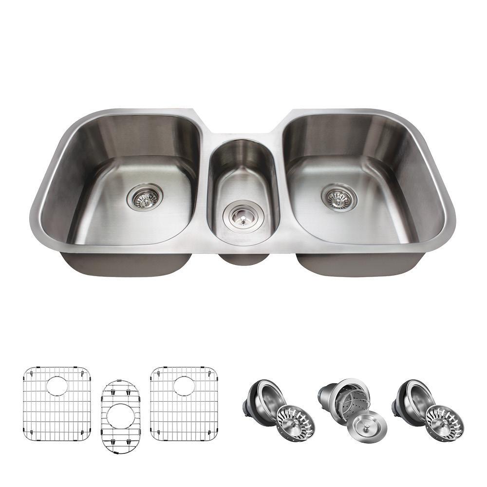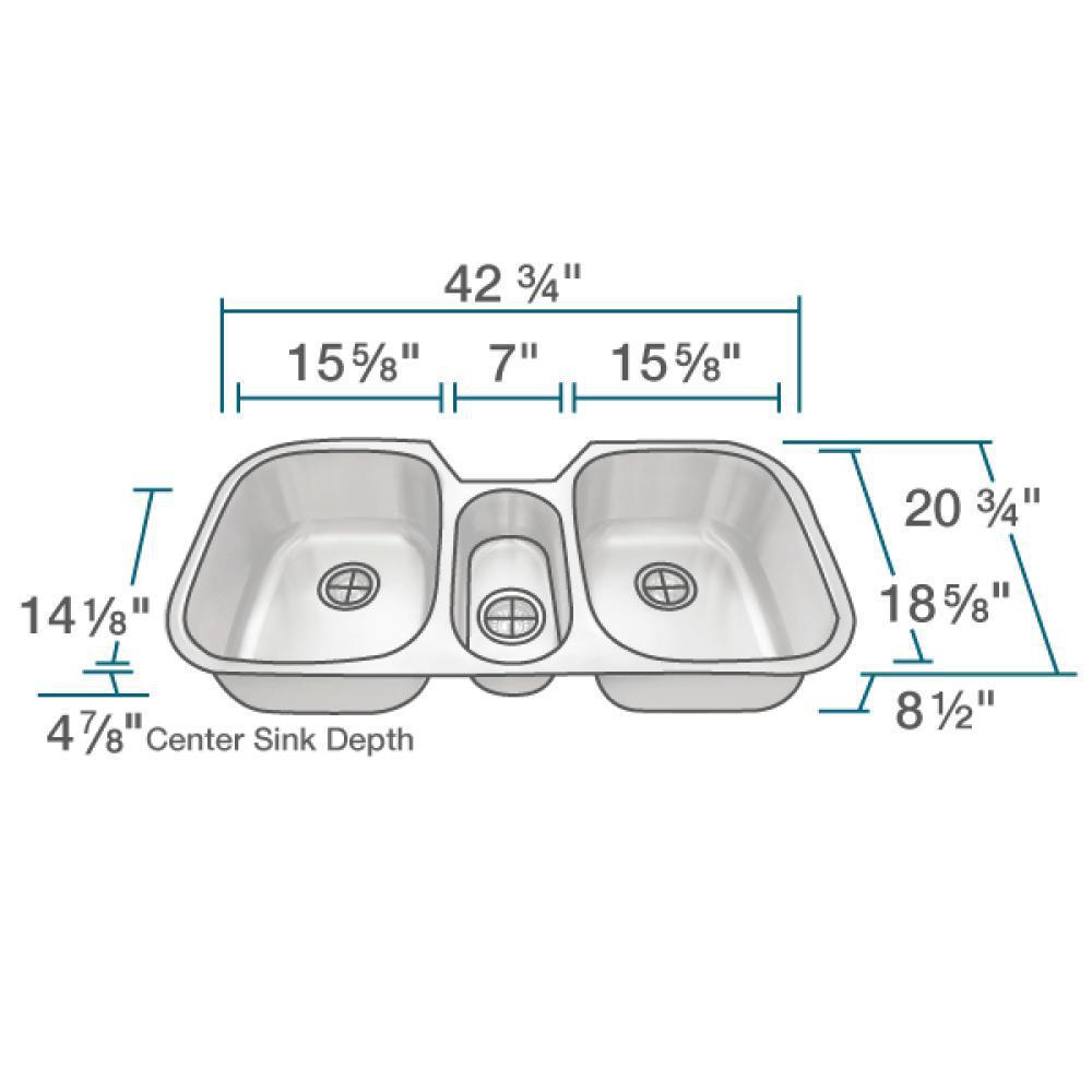 An extremely busy kitchen requires an extremely functional sink. This undermount model features two equal-sized bowls of reasonable depth straddling a smaller, shallower prep basin. The center sink is aligned with the front of the other bowls, creating a void along the back for installation of the faucet. This model is 304-grade, cold rolled steel, at the industry standard 18-Gauge thickness. The surface is given a brushed-satin finish which adds to its luster and masks minor scratches which could occur over time. Dense, sound-dampening pads and an insulation coating are applied to the underside. With an overall measurement of 42-3/4 in. x 20-3/4 in. x 8-1/2 in., it will require a minimum-width cabinet of 45 in. It is cUPC certified. Our high-quality stainless steel grids are custom-made to fit each basin. They help protect the surface from scratches and dents and prevent water from contaminating food. Their removable rubber feet raise them slightly above the bottom of the sink. Included is two standard strainers - a solid traditional choice with a shallow removable receptacle; and one basket strainer - a deep, perforated, handled, metal basket designed to hold considerably more waste.