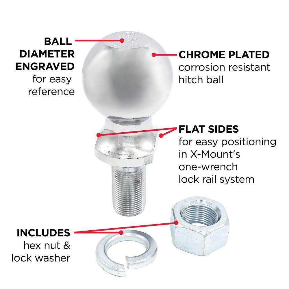 The TowSmart Hitch Ball is a key component to create a secure connection between your vehicle and trailer when towing your valuable assets. The heavy-duty construction is extremely durable with a chrome plated finish that is corrosion resistant. The hitch ball provides wrench flats for easy positioning in the X-Mount lockrail system. The lockrail functions as a built-in wrench preventing hitch ball rotation during installation or removal. The wrench flat design is universal to be used with any standard ball mount. It is important to know the total weight of the trailer (GTW) you are towing and the maximum towing capacity determined by the vehicle manufacturer.