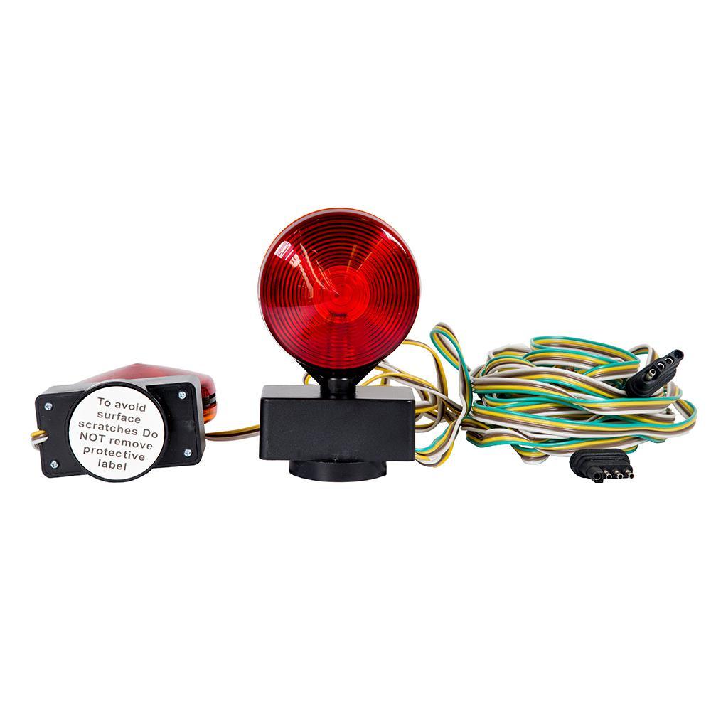 The TowSmart Magnetic Towing Light Kit mounts directly on any vehicle and should be used for towing applications under 80 in. W. Heavy duty magnetic bases provide superior stability and take the hassle out of installing towing lights. The light kit features a combination of round, dual color incandescent lights. The double sided light functions as a tail light, turn signals and brake light. Constructed from durable corrosion resistant housing to withstand harsh weather conditions. For added value, the kit includes: 2 towing lights, wiring harness and 4 wire flat connectors. This light kit allows a temporary towing solution without the hassle of installing tow lights.