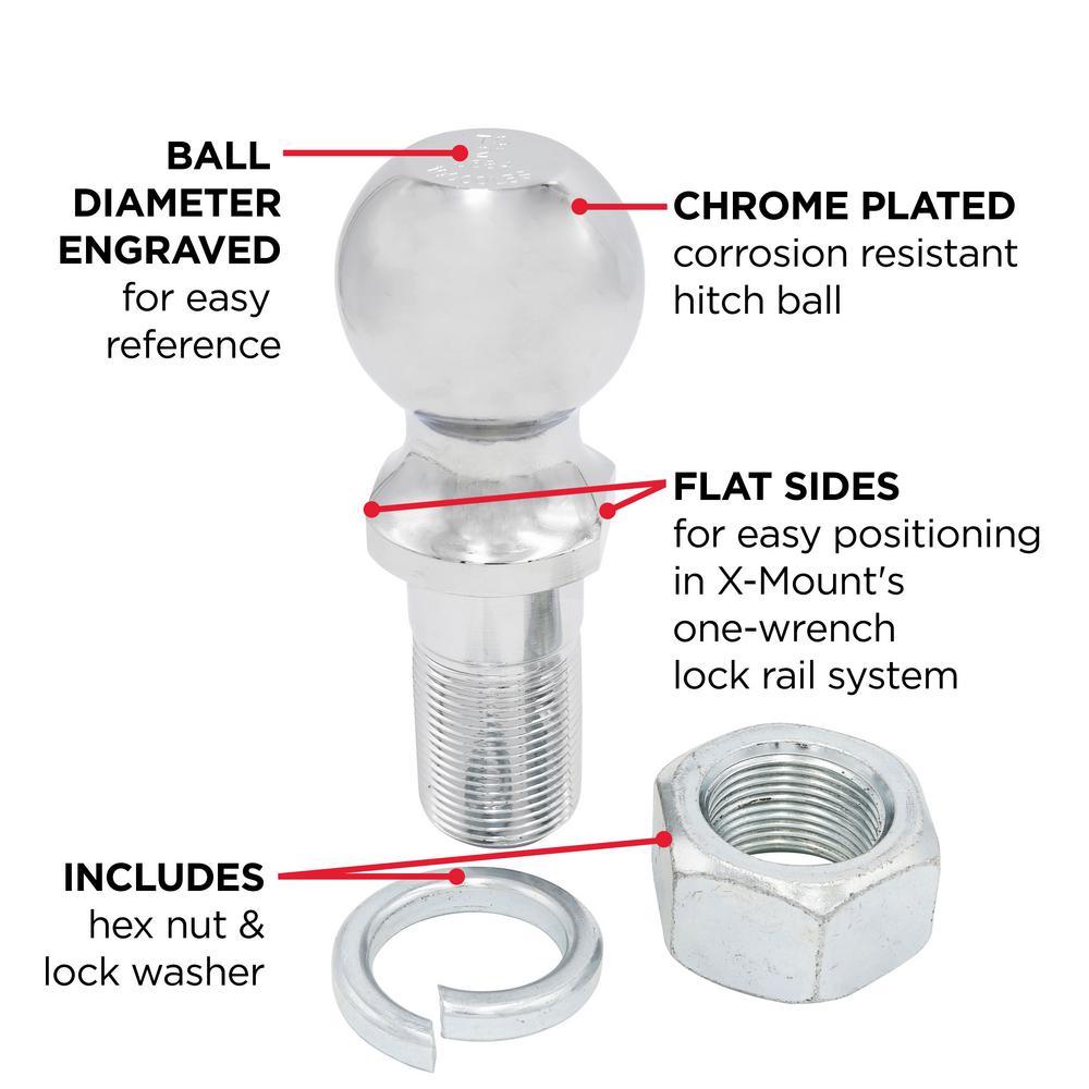 The TowSmart Hitch Ball is a key component to create a secure connection between your vehicle and trailer when towing your valuable assets. The heavy-duty construction is extremely durable with a chrome plated finish that is corrosion resistant. The hitch ball provides wrench flats for easy positioning in the X-Mount lockrail system. The lockrail functions as a built-in wrench preventing hitch ball rotation during installation or removal. The wrench flat design is universal to be used with any standard ball mount. It is important to know the total weight of the trailer (GTW) you are towing and the maximum towing capacity determined by the vehicle manufacturer.