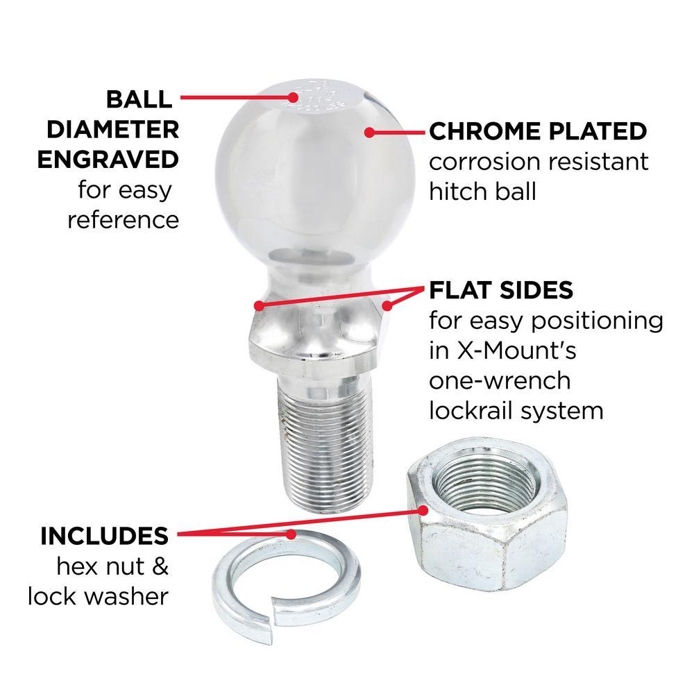 The TowSmart Hitch Ball is a key component to create a secure connection between your vehicle and trailer when towing your valuable assets. The heavy-duty construction is extremely durable with a chrome plated finish that is corrosion resistant. The hitch ball provides wrench flats for easy positioning in the X-Mount lockrail system. The lockrail functions as a built-in wrench preventing hitch ball rotation during installation or removal. The wrench flat design is universal to be used with any standard ball mount. It is important to know the total weight of the trailer (GTW) you are towing and the maximum towing capacity determined by the vehicle manufacturer.
