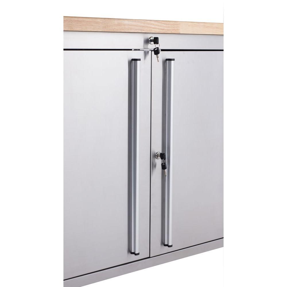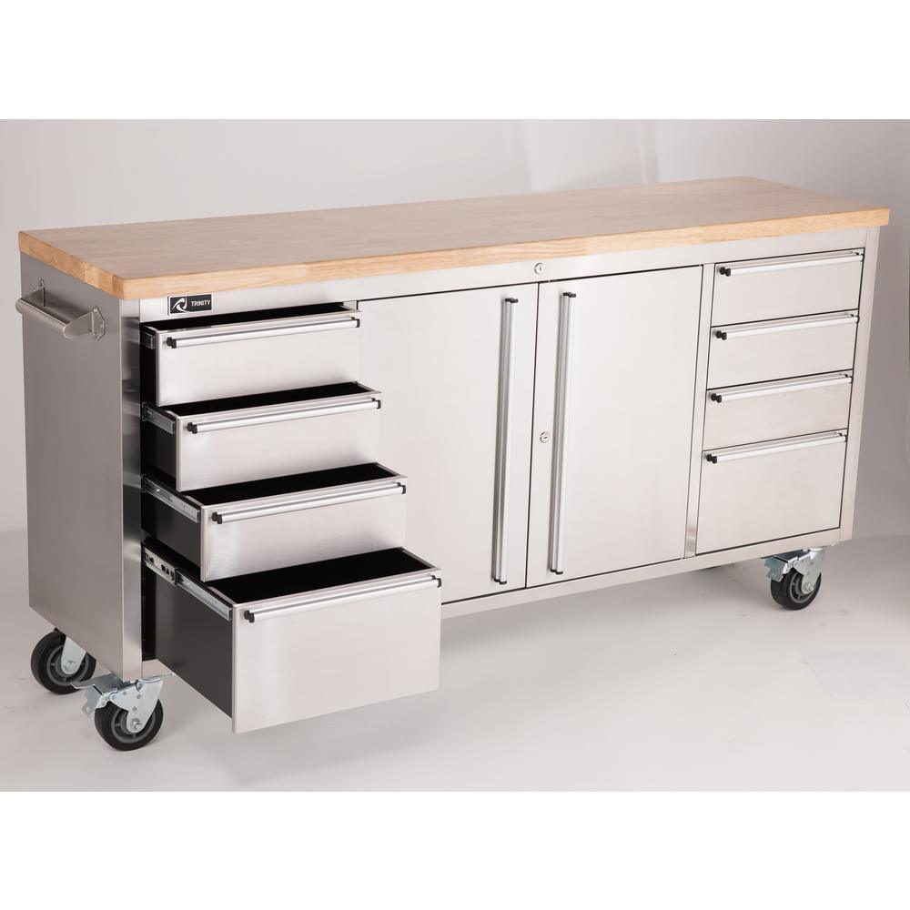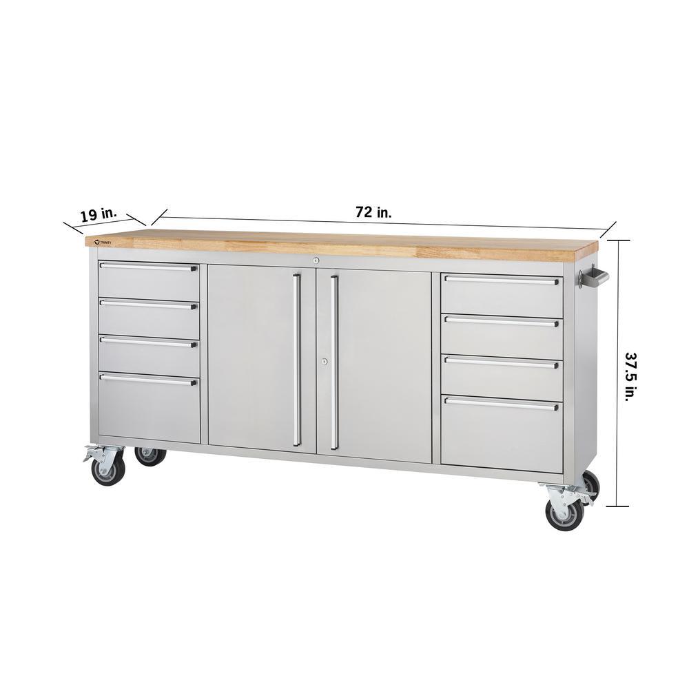 Keep your garage neat with the 37 in. x 72 in. x 19 in. Steel Eight-Drawer Rolling Workbench in Stainless Steel. Designed to ensure toughness and structural integrity, it has a 20-gauge steel construction, ideal for both professional tradesman and DIYers. The cabinet has adjustable shelves for ultimate customization. This high-quality mobile workbench is made with eight drawers - six medium and two large and features a total holding capacity of 26,000 cu. in., providing plenty of storage for all your tools. Great for smooth operation, it is designed with ball bearing slides that can hold up to 100 lbs. to accommodate heavy loads. With a central locking system, it is a safe place to store your tools and equipment. This tool storage system utilizes swivel casters and features two push handles for comfortably moving the unit. Upgrade your tool and hardware storage with the 37 in. x 72 in. x 19 in. Steel Eight-Drawer Rolling Workbench in Stainless Steel.