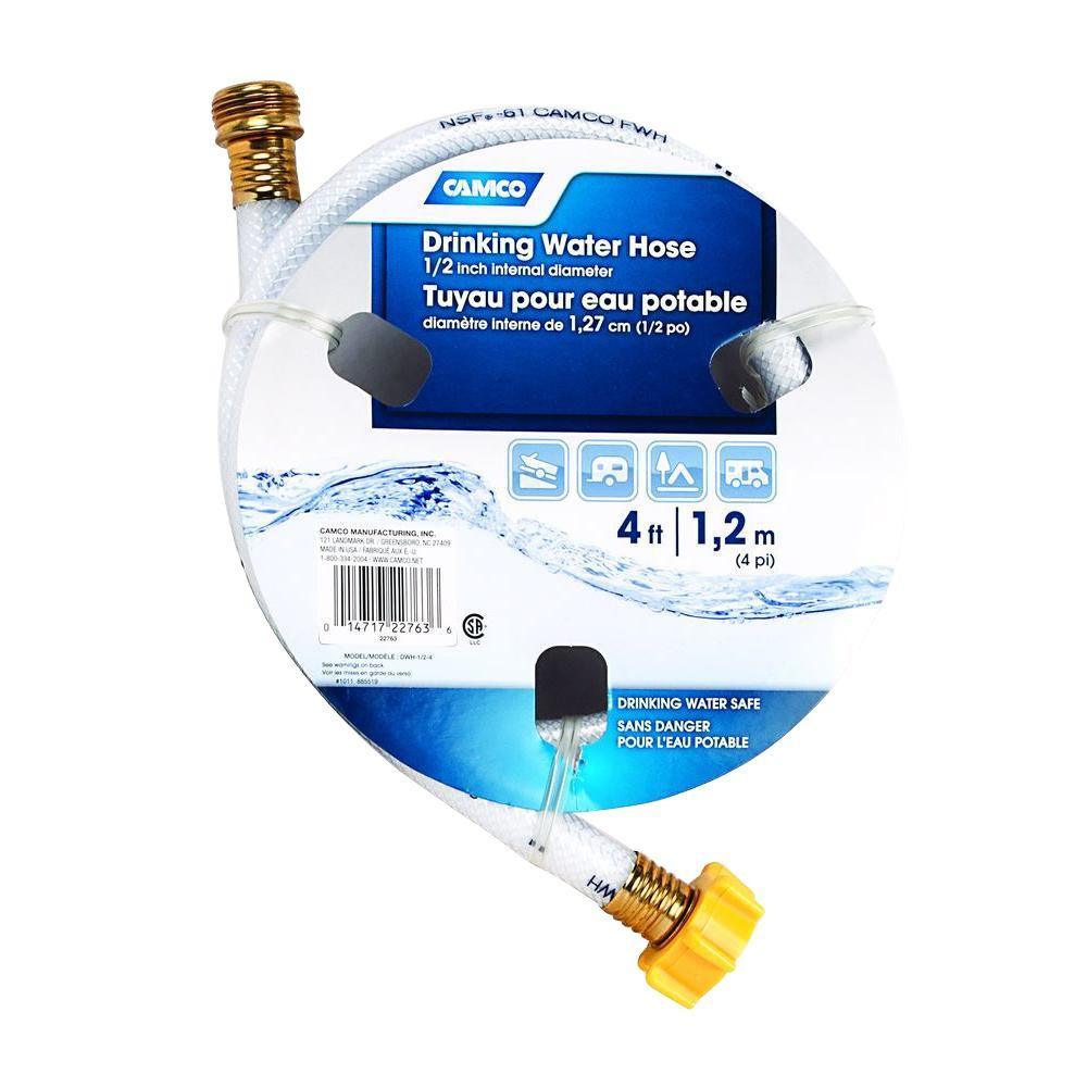 Camco's TastePURE 4 ft. x 1/2 in. I.D. Drinking Water Hoses are reinforced for maximum kink resistance. Especially useful when hooked with a Y-valve to your main faucet. Made with NSF certified hose; drinking water safe. Hose is made of PVC and is BPA free. CSA low lead content certified. Complies with California’s AB1953 and Vermont Act 193 Low Lead Laws.