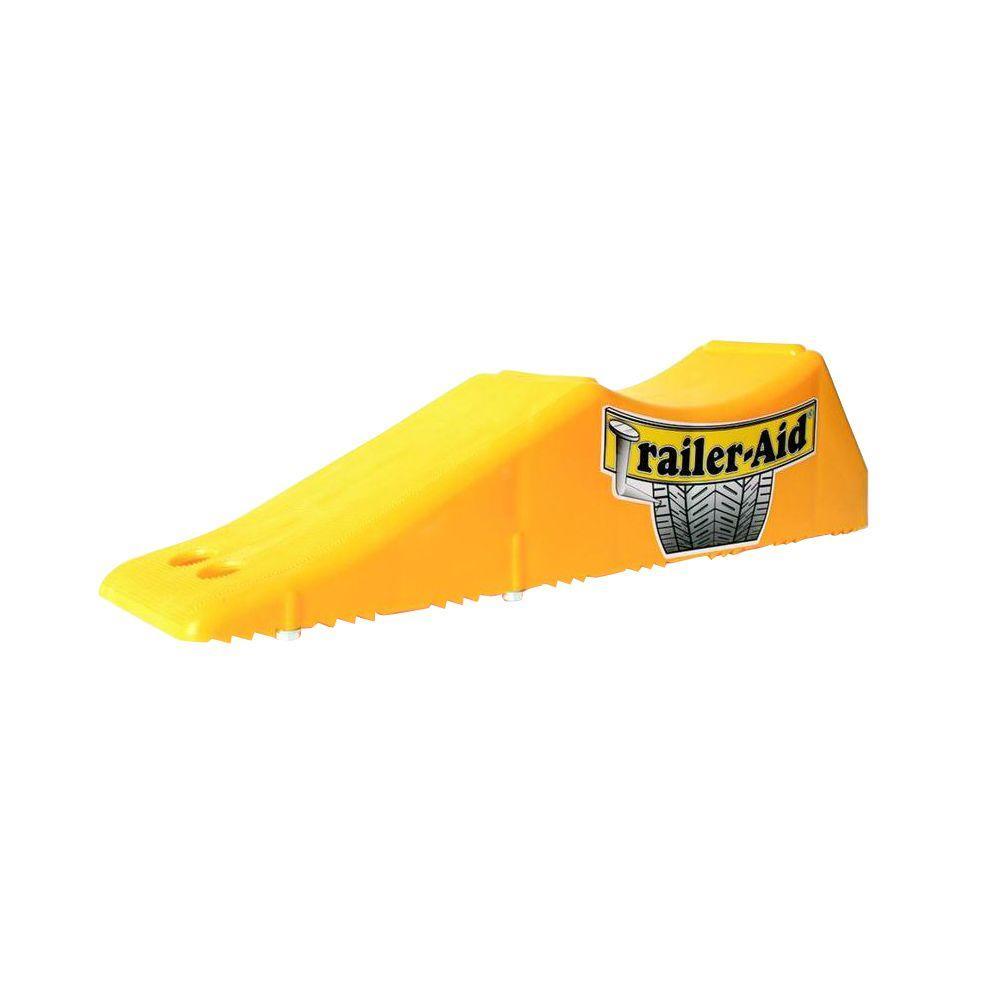 Trailer Aid A fast, safe, easy way to change a flat without having to unload. Simply ride the good tire onto the jack and change your tire. For double Axle Trailers up to 15,000 lbs. loaded. Made of lightweight, high-strength, rust-proof polymer, with traction treads. Front holes and rear slots allow for easy handling. Use as a wedge chock when parked. Matte black or yellow finish with rounded corners. The bottom has cross mesh design for super strength. With 4 steel feet and traction treads for sure grip on all surfaces.