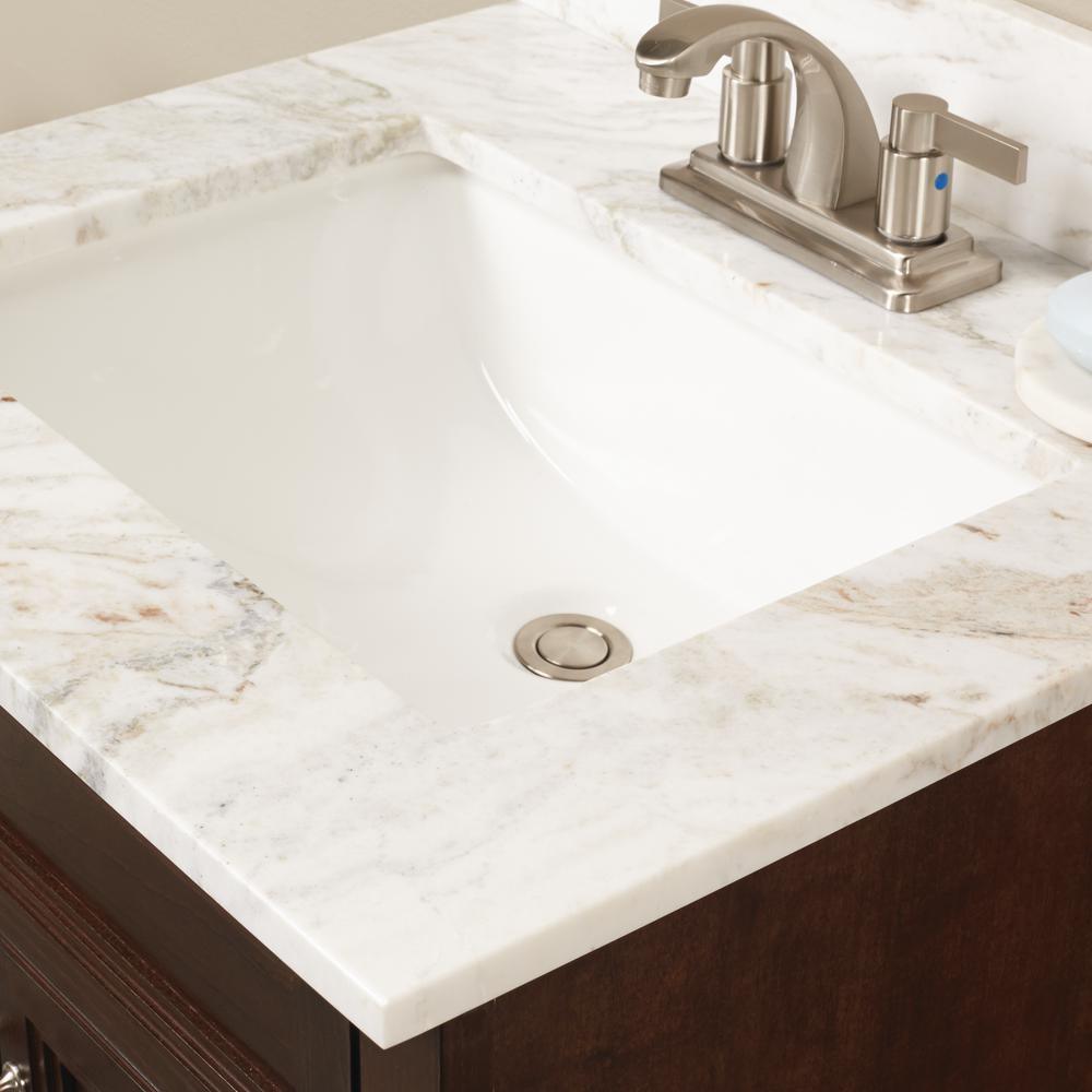 Add a luxurious touch to your space with Arabescato Venato Marble vanity top and attached under-mount vitreous-china sink. A lovely blend of clean whites and distinctive veining, Arabescato Venato Marble brings sophisticated style to the room. Ideal for various installs, this vanity top is the perfect solution for quick and easy remodels. Note: Digital photographs are not fully representative of the final product and do not exhibit all the characteristics of a design. Variations in color, pattern, size, shape and shade are inherent and unique characteristics of an engineered marble and it is to be expected with this product. Performance of the material is not affected by these variations and do not qualify for product replacement. All stone can be damaged by force and no stone is chip proof. Objects hitting edges particularly at sinks may cause chips. Surfaces can be damaged by sudden and/or rapid change of temperature, especially near the edges, as well as direct and/or sustained heating of top.