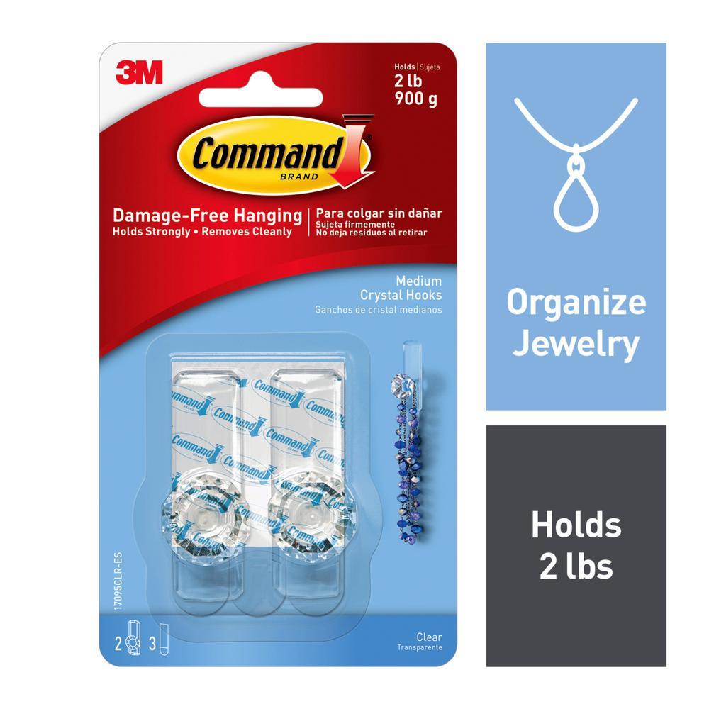 The Command Clear Medium Crystal Knob Hook is great for displaying and organizing your jewelry and accessories where you can see them in the bedroom and closet. Command Clear Hooks and Strips blend in seamlessly allowing you to show what matters most, your decor, not how it's hung-up. Forget about nails, screws and tacks, Command Clear Hooks are fast and easy to hang. Uses revolutionary Command Clear Adhesive Strip to hold strongly on a variety of surfaces, including paint, wood, tile and more. Removes cleanly - no holes or sticky residue. Re-hanging them is as easy as applying a Command Clear Refill Strip, so you can take down, move and reuse them again and again.