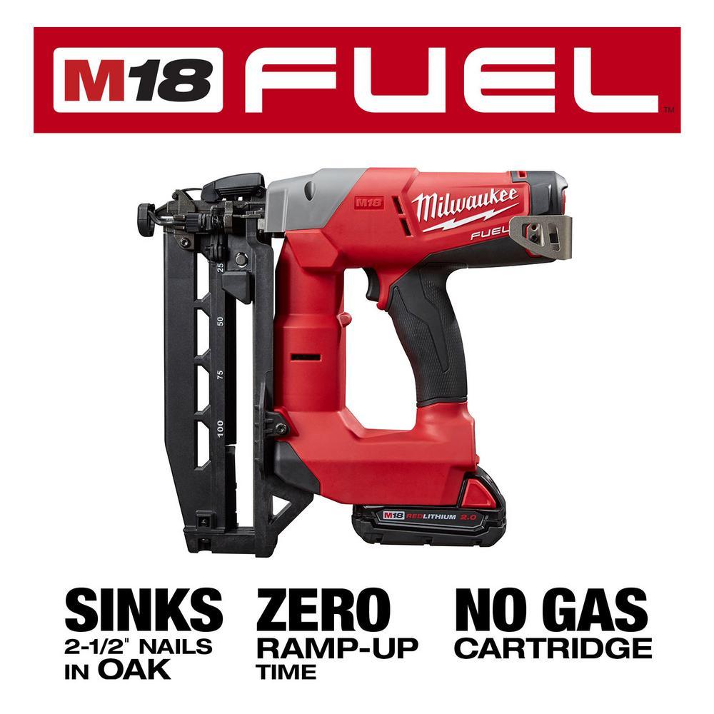 The M18 FUEL 16-Gauge Straight Finish Nailer delivers on the promise of peak productivity at your worksite, providing unmatched driving power, speed and efficiency – with practically no set up and minimal maintenance. Using the exceptional application speed, power and durability of our compact POWERSTATE Brushless Motor, plus our ready to fire cylinder design, this tool is capable of fully sinking 2- ½ in. nails into solid oak with zero ramp-up time. This 18-Volt nailer operates from the revolutionary REDLITHIUM Battery for unbeatable strength and run-time, eliminating the mess and cost of gas cartridges. It also includes REDLINK PLUS Intelligence, the most advanced electronic system on the market, to prevent damage to the nailer and battery from overloading and overheating. The M18 FUEL Nailer not only primes you for top performance; it also creates the experience of a pneumatic nailer that professional carpenters and remodelers expect, without the hassle of compressors and hoses.