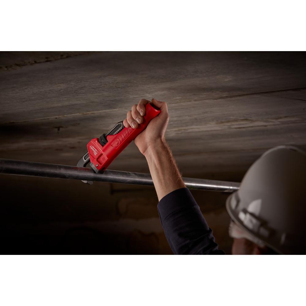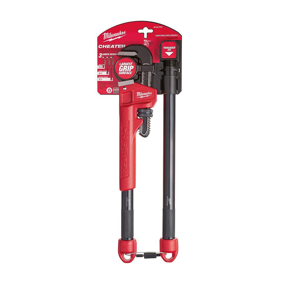 Milwaukee 48-22-7314, Cheater Adaptable Pipe Wrench features a New-To-World 3 length design which delivers maximum productivity to the professional user. The Cheater Adaptable Pipe Wrench comes with (2) interchangeable threaded fit handles offering the versatility of 10 in. mode when used with no handle for tight spaces, 18 in. mode with the small handle for general purpose and 24 in. mode with the long handle for maximum leverage and reach. The Cheater Adaptable Pipe Wrench features and overbite jaw design offering the largest gripping surface. Dual coil springs offer maximum durability and tool life and the ergonomic handle form has been designed for maximum comfort and won't dig into the palms. Through hardened jaws deliver increased grip and tooth durability and a tether-ready handle loops makes the Milwaukee 48-22-7314 perfect for the toughest of jobsites. Milwaukee stands behind their product and offers a Limited Lifetime Warranty with all pipe wrenches. The Milwaukee 48-22-7314 includes (1) 48-22-7314 18 in. Cheater Adaptable Pipe Wrench and (2) interchangeable threaded fit handles.