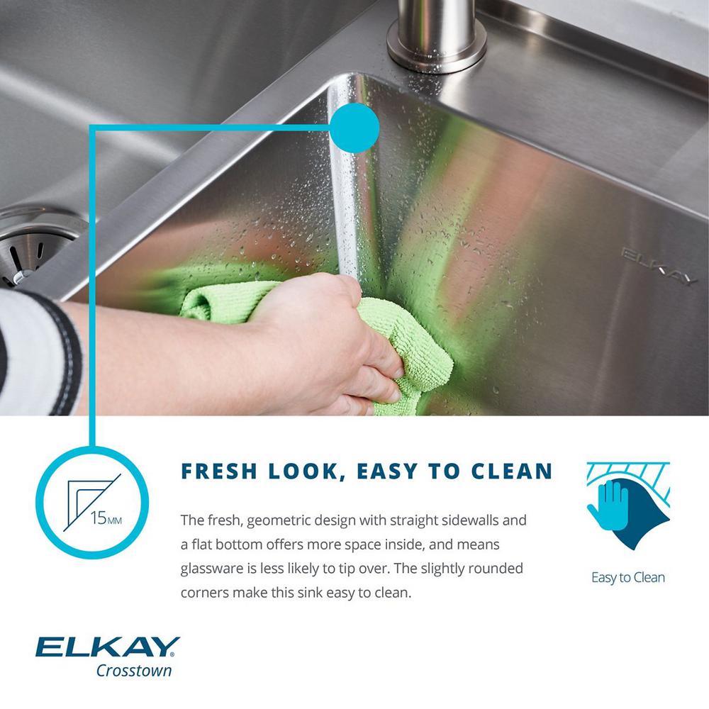 Elkay Crosstown is the ultimate mix of beauty, function and modern design. Straight sidewalls, a flat bottom and tight corners provide more space inside the sink for stacking and washing dishes. The striking geometric aesthetic has universal appeal and makes an impact in any space.