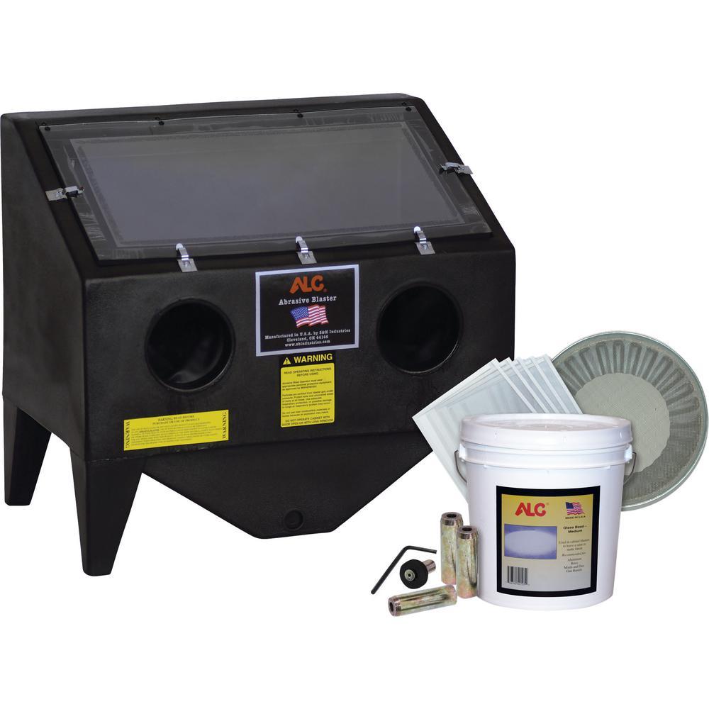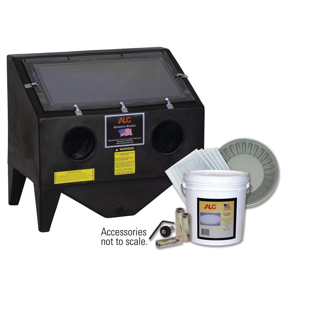 This ALC polymer bench top abrasive blast cabinet is prefect for a wide variety of surface preparation jobs such as removing paint, scale, rust and oxidation. Made of tough LDPE polymer plastic that is designed to outlast steel blasting cabinets. 1-piece construction means there are no seams to leak, keeping the blasting operation contained inside the cabinet. Inside work area of 30 in. W x 27 in. H x 20 in. D to accommodate a large variety of items. Includes everything you need to start your blasting project today; a pair of rubber blast gloves, trigger control blast gun with 1/4 in. steel nozzle, 25 lbs. of glass bead abrasive, 5 pack of protective window underlay, 1/4 in. steel nozzle kit and an abrasive strainer. Simply fill with abrasive and connect to an air compressor.