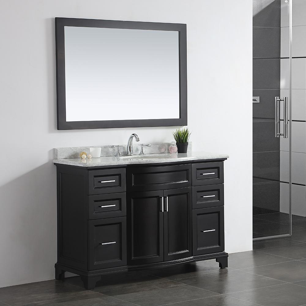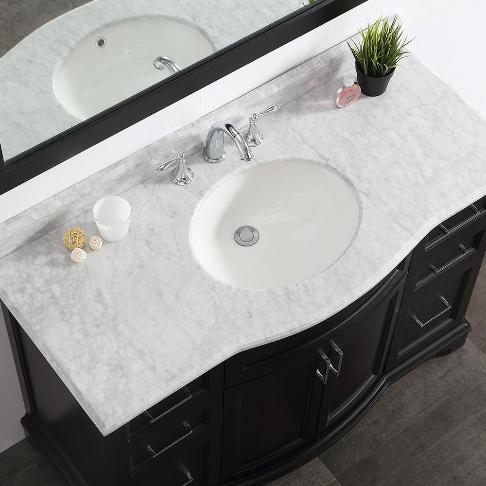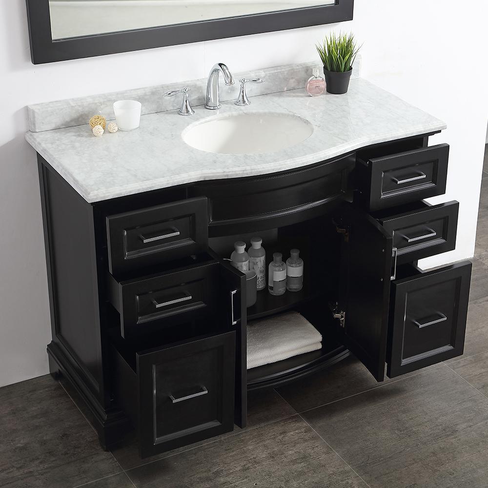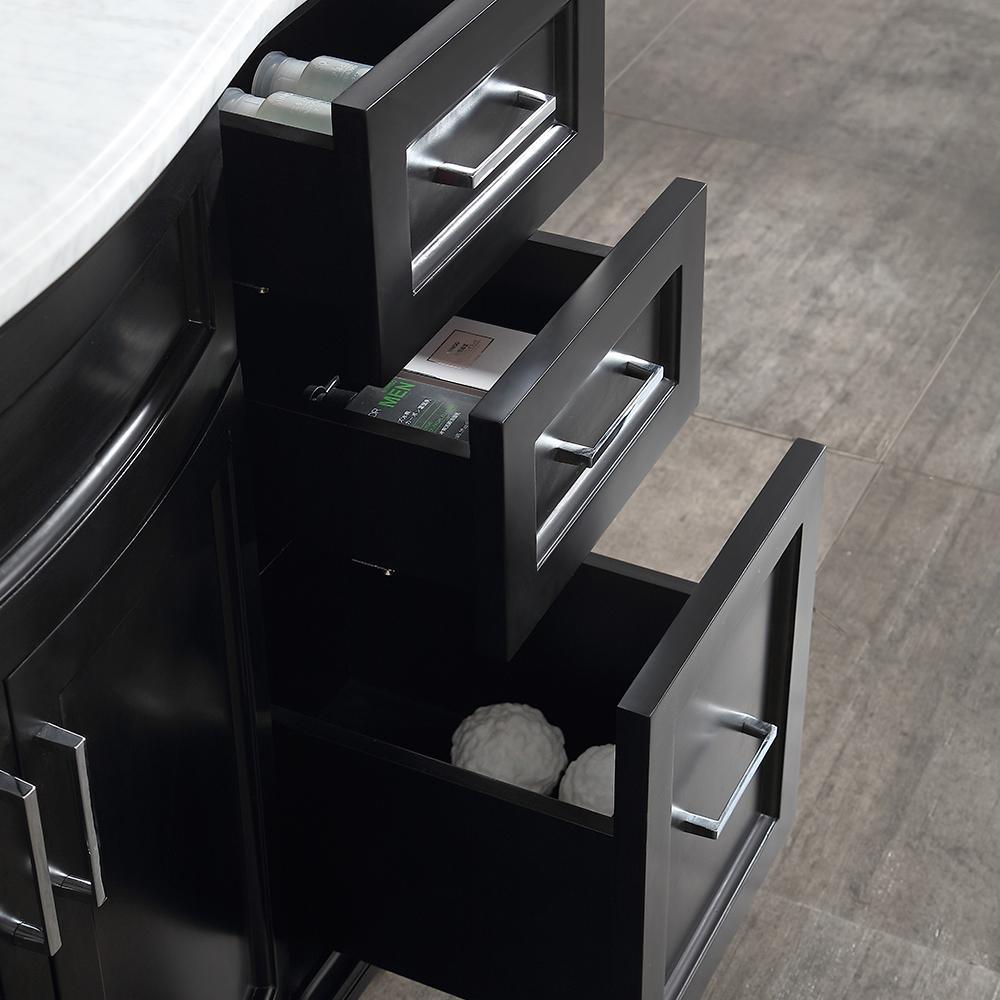 The uniquely bowed-front design of our Jason Vanity makes it a distinct addition to any bathroom. Offering ample storage space, this bathroom vanity features a gorgeous espresso finish and an authentic Carrara marble counter top. The square ceramic basin and soft-closing hinges make this piece a chic and desirable addition to any home.