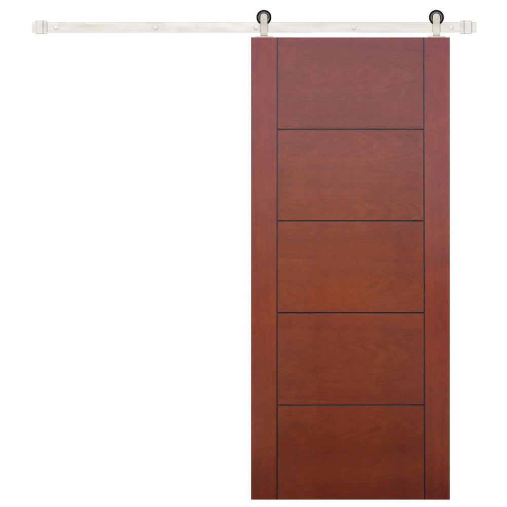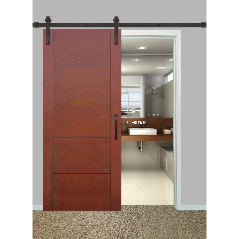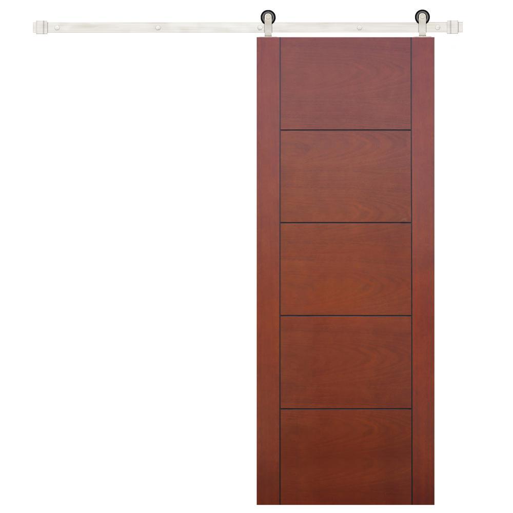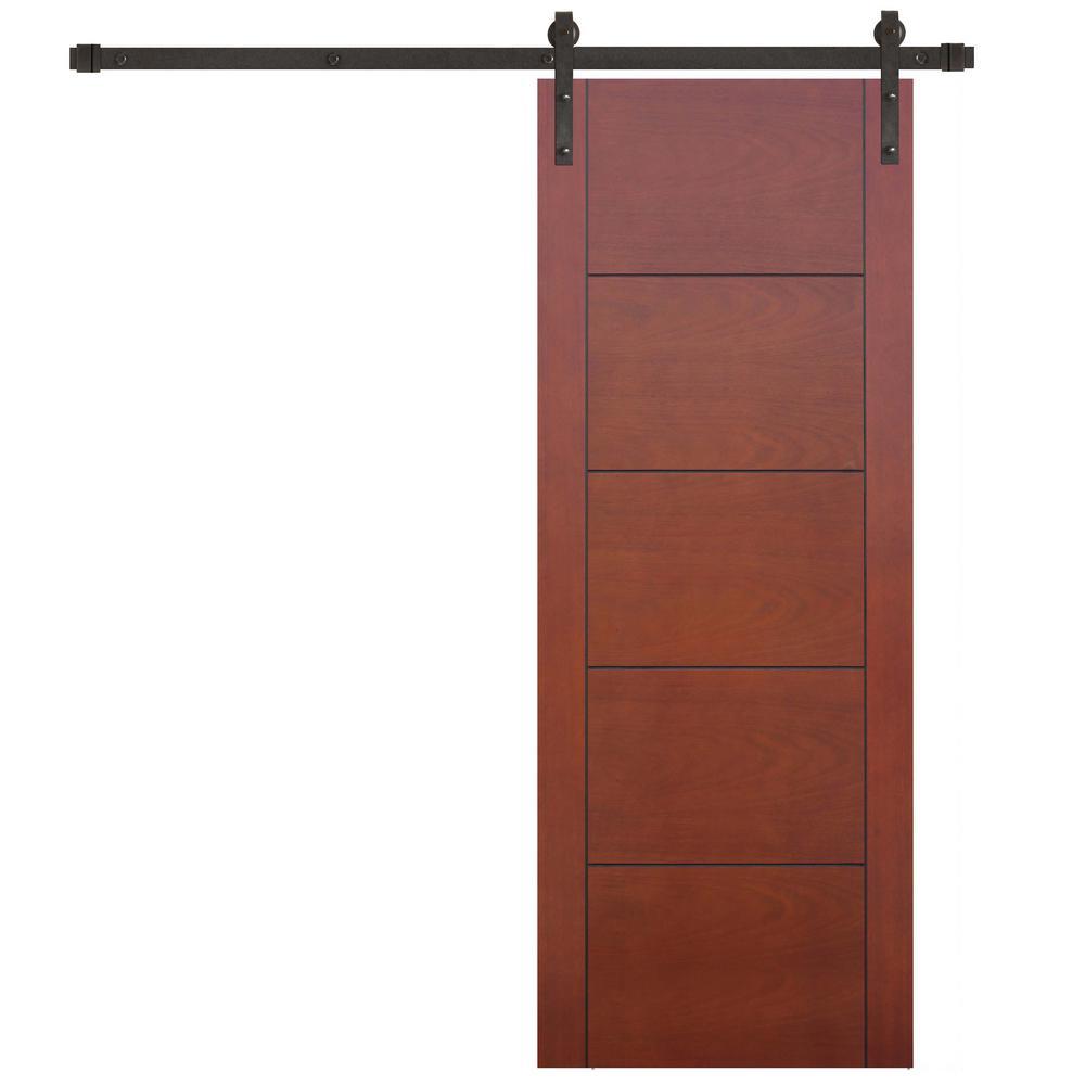 36 in. x 84 in. Contemporary Prefinished 5-Panel Flush Mahogany Wood Sliding Barn Door with Bronze Hardware Kit