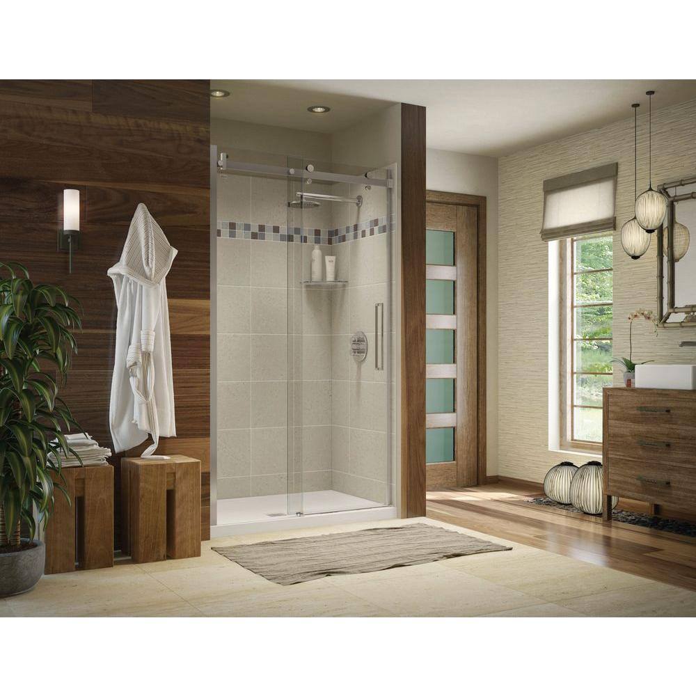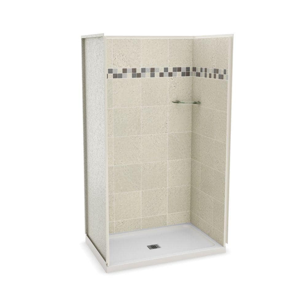 Create a luxurious bathroom space with ease and efficiency thanks to Utile by MAAX. This innovative shower wall solution offers a variety of vibrant colors, intricate textures, and fashionable patterns that mimic the look and feel of tile, all while being installed in just 1 day compared to the 3 days required for traditional ceramic tile. The Utile alcove shower kit includes a 48 in. back wall panel, two 32 in. side wall panels in a stone Sahara design, a 10 mm thick glass storage shelf, and a white 48 in. acrylic shower base with a center drain. The sturdy and durable 1-piece wall panels have a sleek matte finish and a grid pattern with a subtle mosaic border in shades of brown, blue, and gray. The mistake-proof ULOK installation system allows for easy alignment, assembly, and locking. No need for a tile or grout protective sealer, providing peace of mind. The direct to stud installation makes the process even simpler.