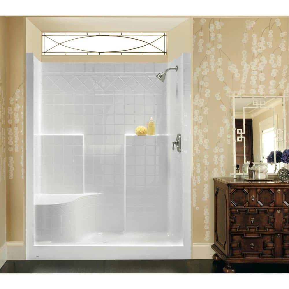 Discover the endless possibilities with our shower collection, offering an array of sizes from 32 in. to 60 in. Choose from a variety of tile-pattern and smooth wall finishes to suit your style. This shower stall is constructed with an Acrylx applied-Acrylic finish reinforced with Armorcore, Aquatic's newest manufacturing breakthrough. Standard features include two integral shelves, a left hand molded seat, and a center drain. The design boasts a decorative diagonal tile pattern and measures approximately 48 in. x 36 in. x 76 in. overall. Perfect for new construction, this 1-piece shower design offers easy direct-to-stud installation and comes with Aquatic's lifetime limited residential warranty. With a slip resistant, textured floor surface and the durability of ArmorCore reinforcement, this shower is both safe and long-lasting.