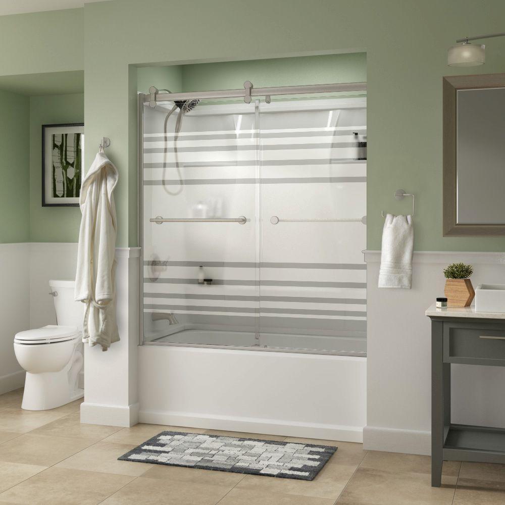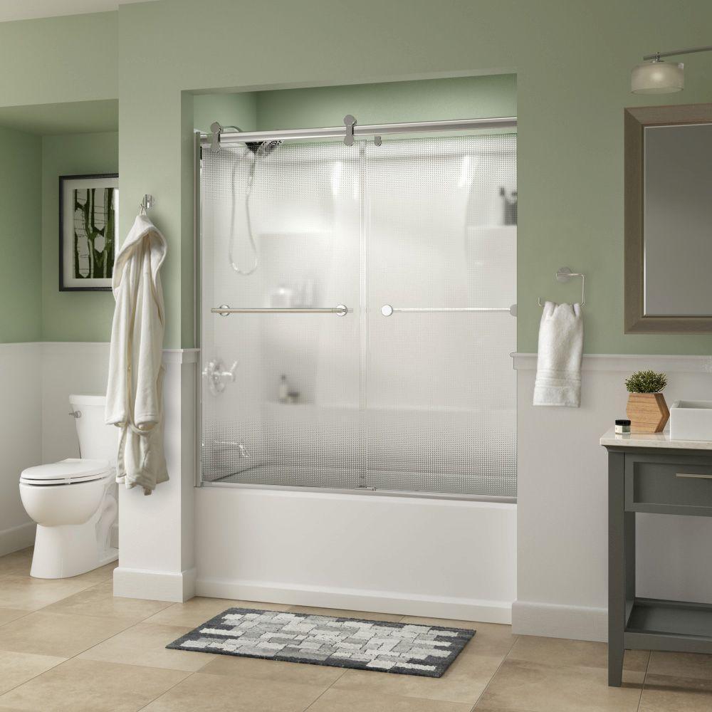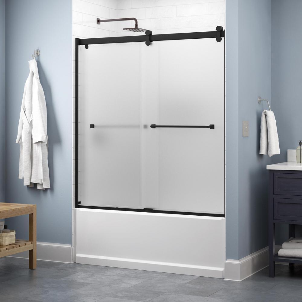 Contemporary sliding bathtub door designed to accommodate out-of-plumb (uneven, not vertically level) conditions totaling 3/8 in.