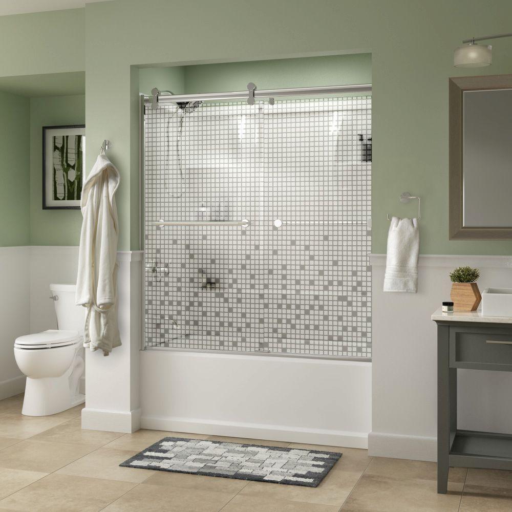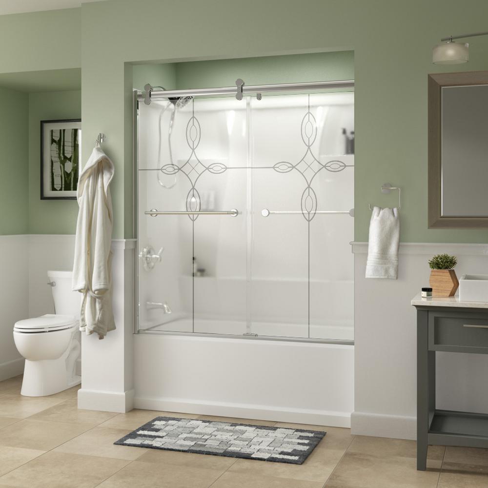 Contemporary sliding bathtub door designed to accommodate out-of-plumb (uneven, not vertically level) conditions totaling 3/8 in.