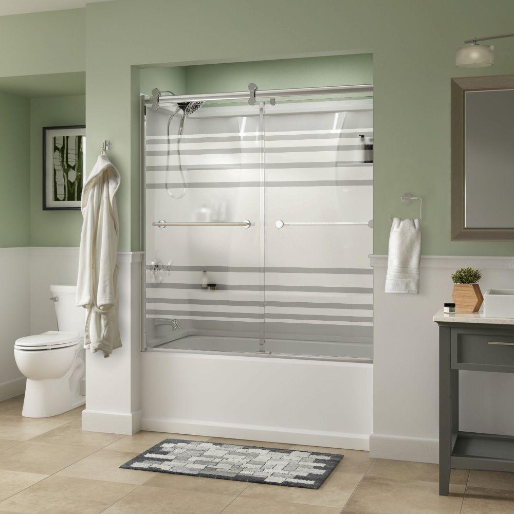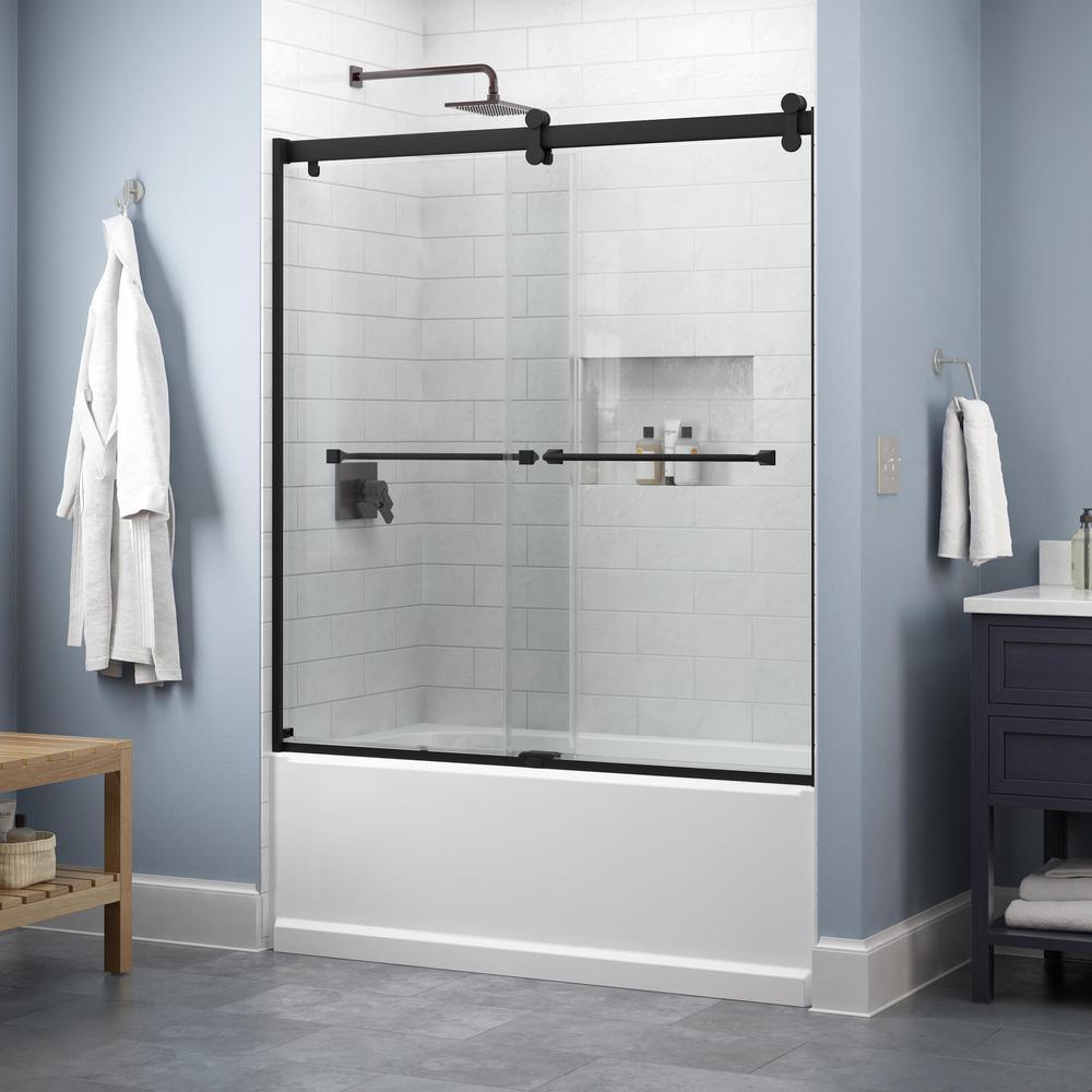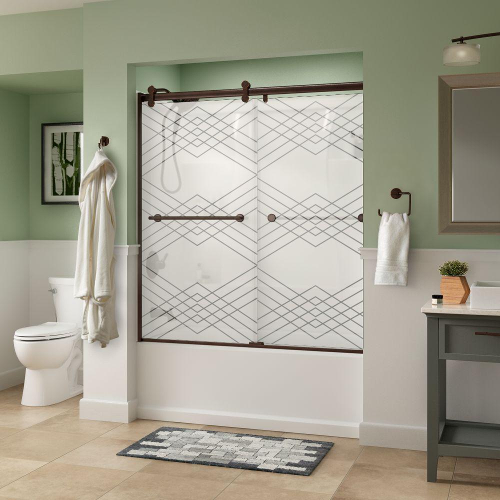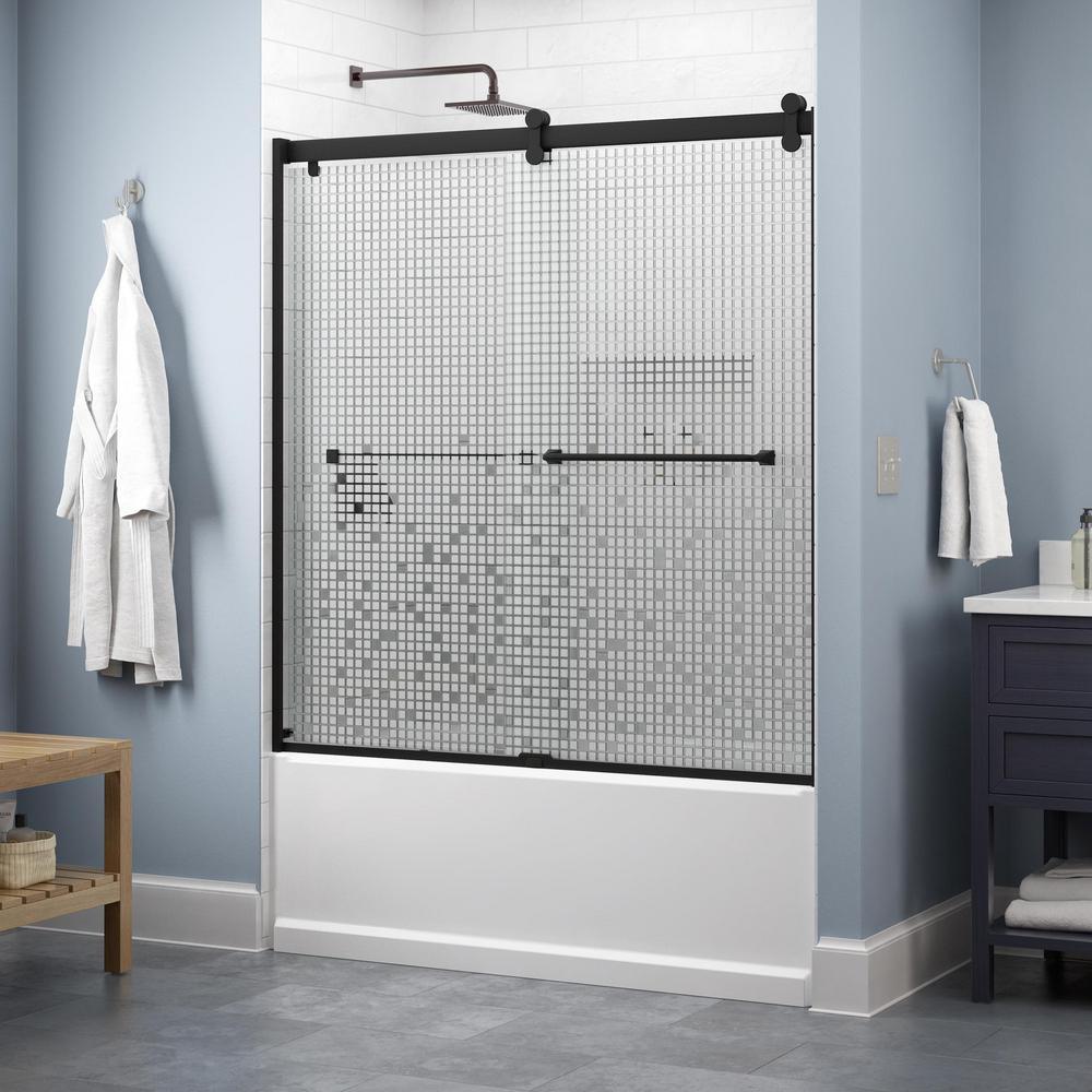 Whether you’re looking for a moderate DIY project or working on a bathroom remodel, upgrading your bathroom with a new sliding shower door is easy with the Delta 1-2-3 custom sliding shower door program. Delta’s custom glass shower door program offers 1000s of design combinations by choosing your glass shower panels, shower door track, and shower door handles to build a unique, personalized glass shower door. Inspired by the trendy barn door style, the Contemporary bathtub door track in bronze is sleek and modern with exposed rollers for the perfect balance of industrial and contemporary design. Make a statement with standard 1/4 in. ANSI certified tempered glass shower panels, featuring a modern blend of clear and frosted stripes creating a beautiful pattern that let’s in light but also offers some privacy. The Lyndall sliding shower door handles in bronze feature two convenient towel bars for extra bathroom storage in a contemporary design silhouette that beautifully demonstrates simplistic, modern elegance.