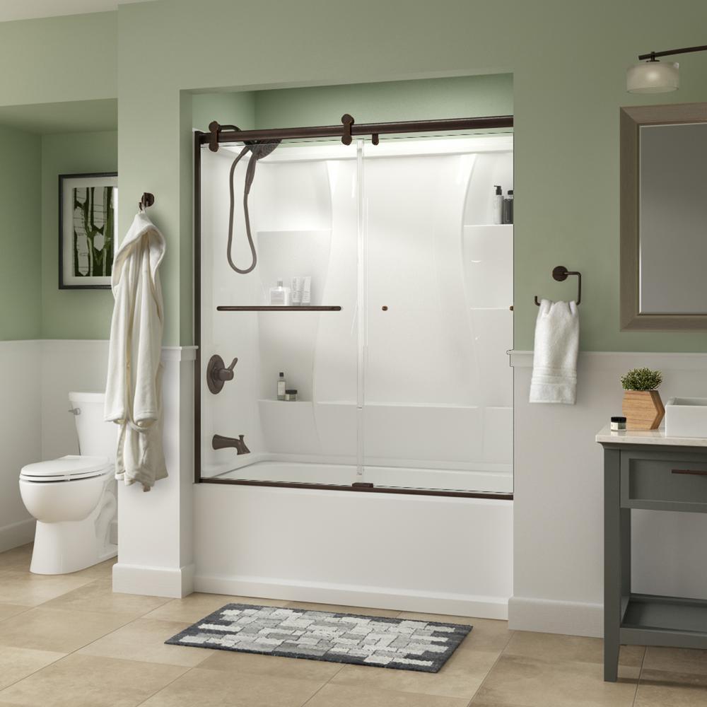 Whether you’re looking for a moderate DIY project or working on a bathroom remodel, upgrading your bathroom with a new sliding shower door is easy with the Delta 1-2-3 custom sliding shower door program. Delta’s custom glass shower door program offers 1000s of design combinations by choosing your glass shower panels, shower door track, and shower door handles to build a unique, personalized glass shower door. Inspired by the trendy barn door style, the Contemporary bathtub door track in bronze is sleek and modern with exposed rollers for the perfect balance of industrial and contemporary design. Make a statement with standard 1/4 in. ANSI certified tempered glass shower panels, featuring a smooth and completely frosted glass with a soft, satin-like look that is more private. The Simplicity sliding shower door handle with knobs features a convenient towel bar for extra bathroom storage and two interior knobs for extra showering space in a simple design silhouette that beautifully combines form and function.
