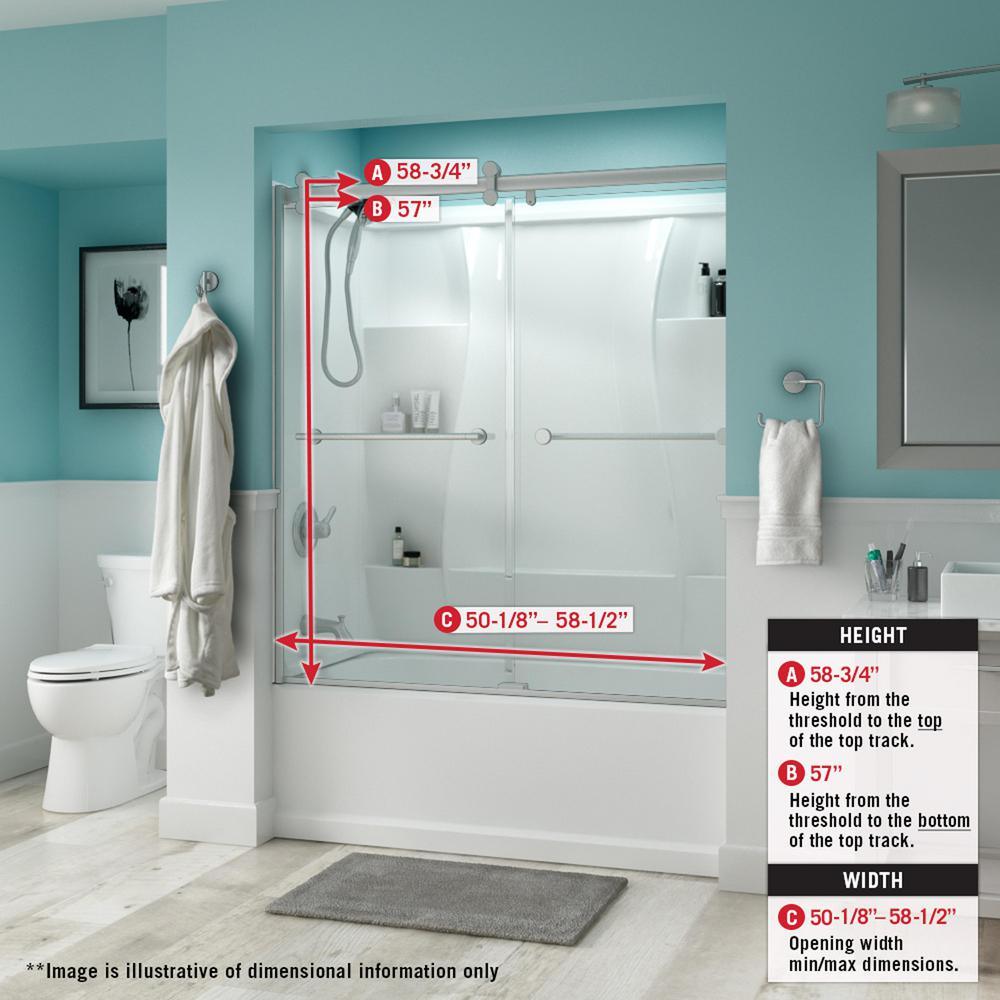 This custom shower door fits openings with a 50-1/8 in. minimum to 58-1/2 in. maximum (127-149 cm) and a 58-3/4 in. height (149 cm) height, offering a walk-in width of 18-1/2 in. to 27 in. (47-69 cm)