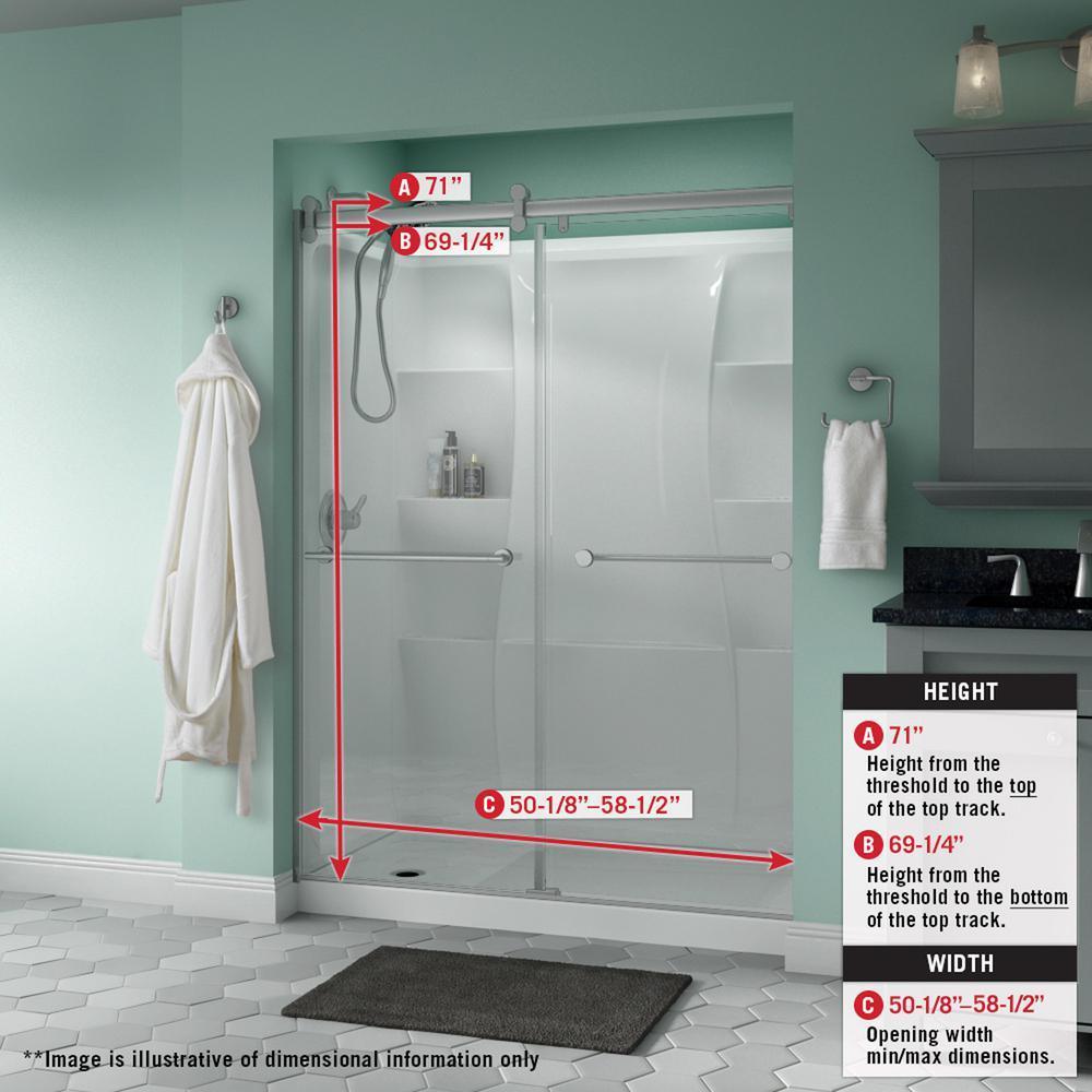 • This custom shower door fits openings with a 50-1/8 in. minimum to 58-1/2 in. maximum (127-149 cm) and a 71 in. height (180 cm) height, offering a walk-in width of 18-1/2 in. to 27 in. (47-69 cm)