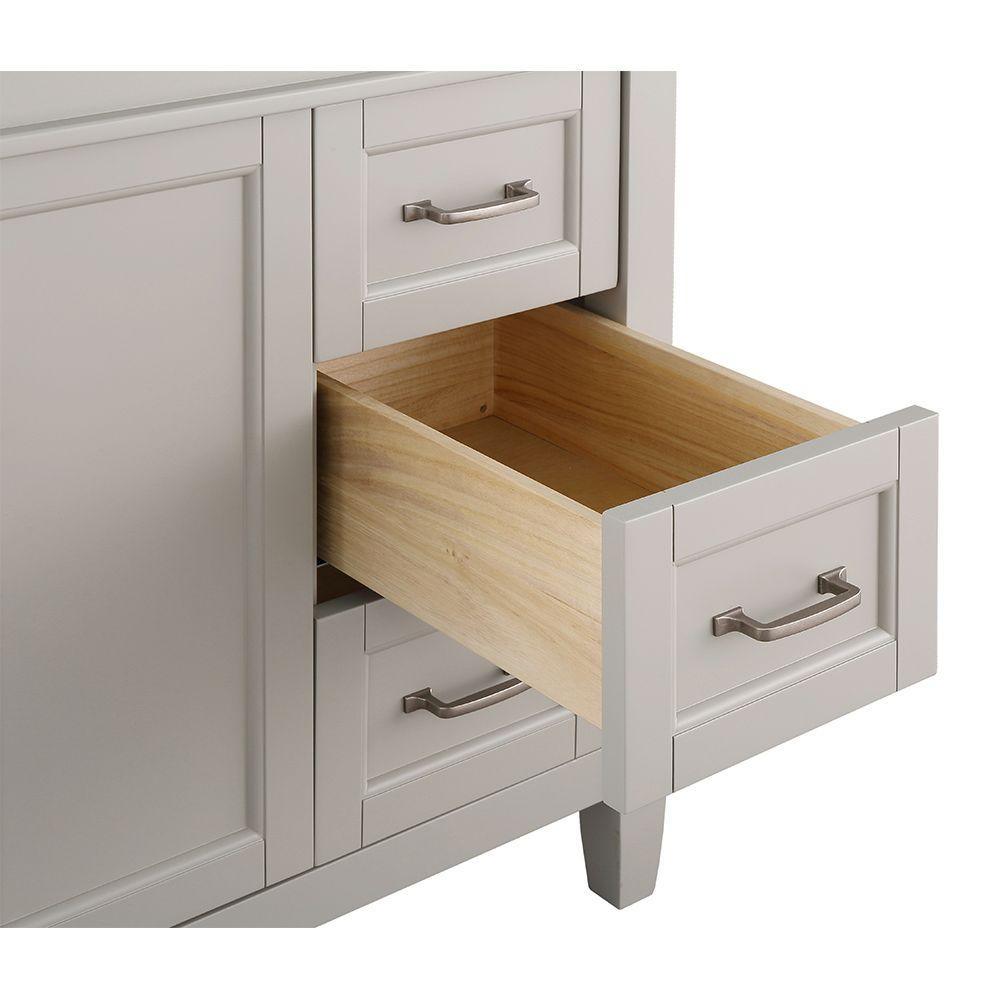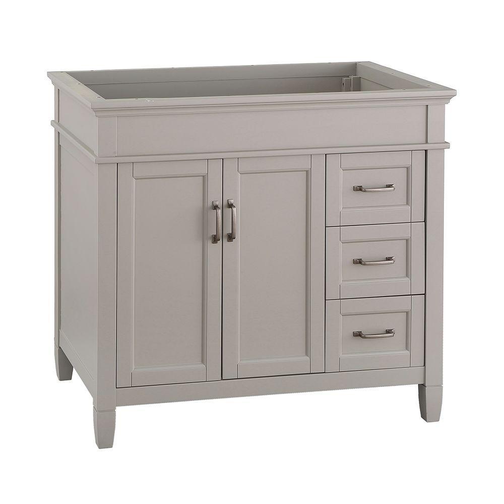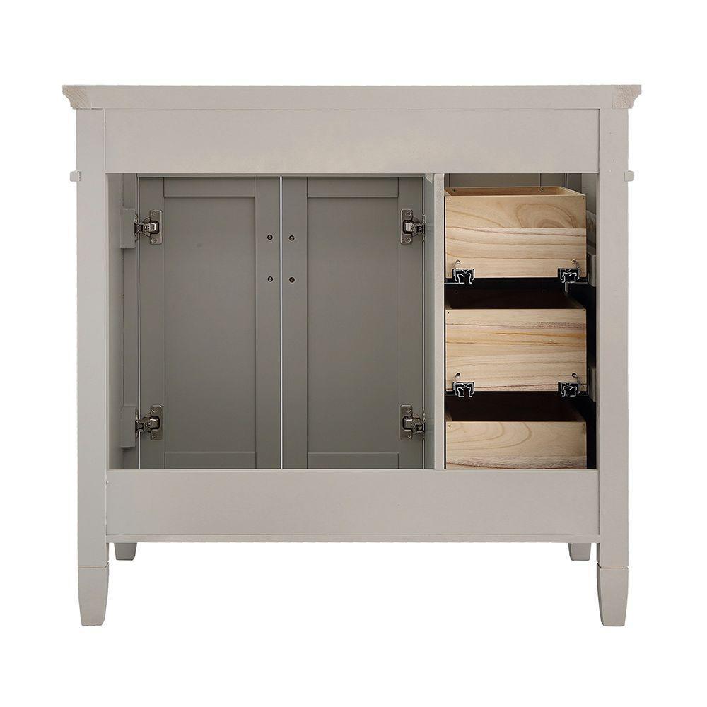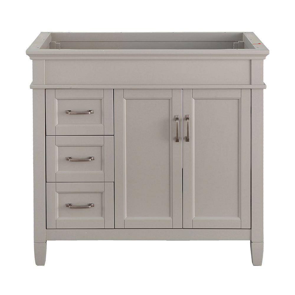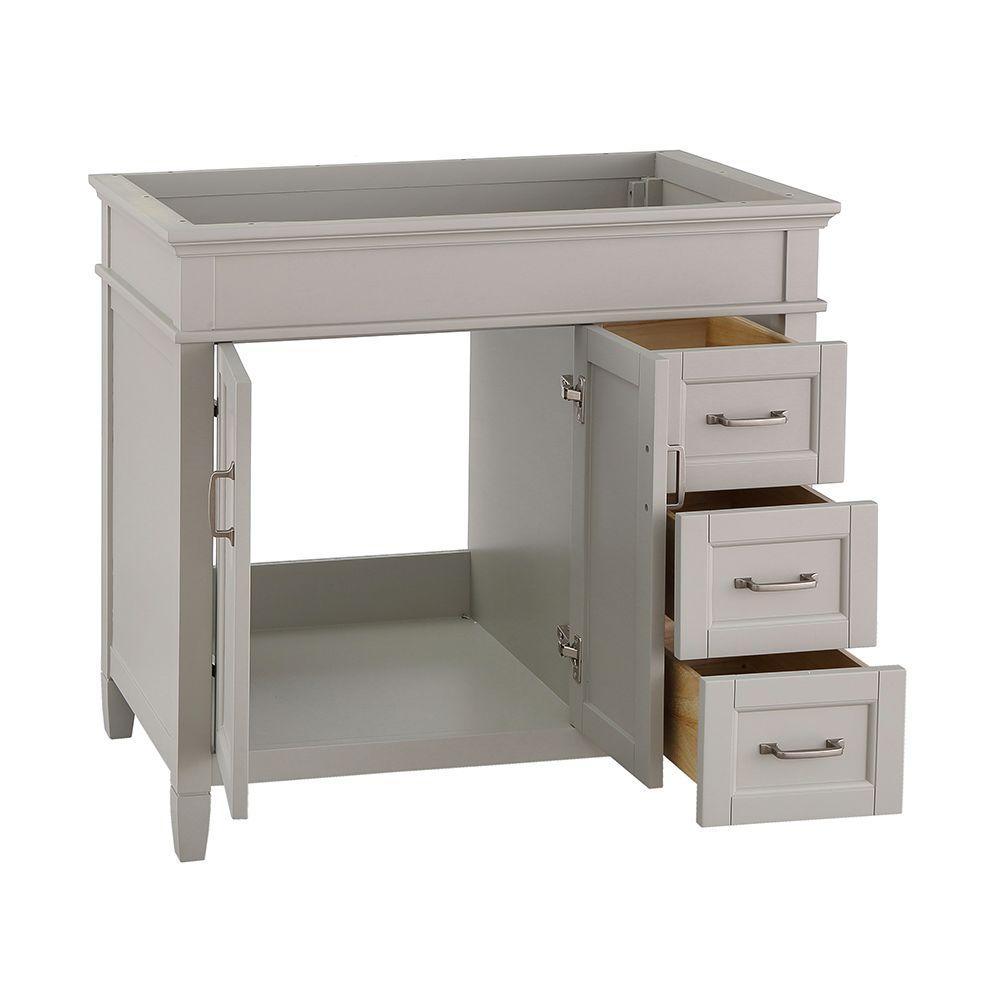 The Ashburn 36 in. bathroom vanity cabinet offers a design that is both decorative and fully functional to complement your decor. This upscale vanity boasts an understated grey finish and a clean, sleek profile for a modern look. Two cabinet doors with soft-stop bumpers and three left-side drawers offer a bevy of storage options for linens and bath essentials, setting the tone for a tidy powder room. The sturdiness and craftsmanship of this vanity cabinet offers a custom look, while small details like leg levelers instill confidence for perfectly stable setups. Pair this vanity cabinet with other items from the Foremost Ashburn collection for a complete bathroom makeover.