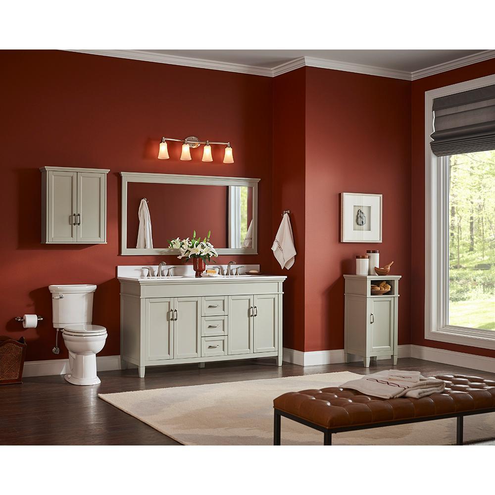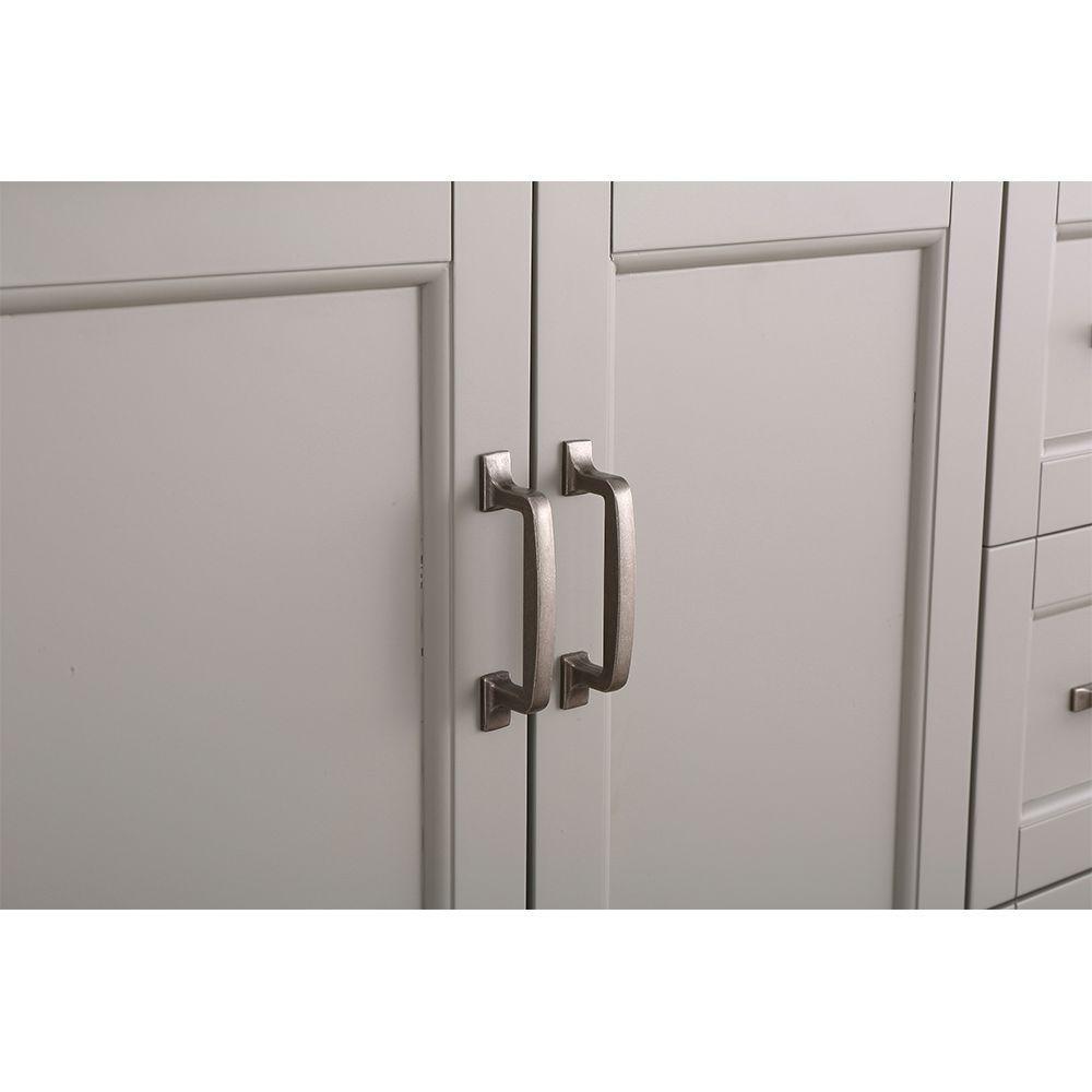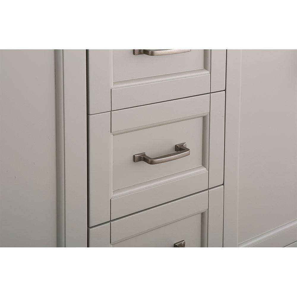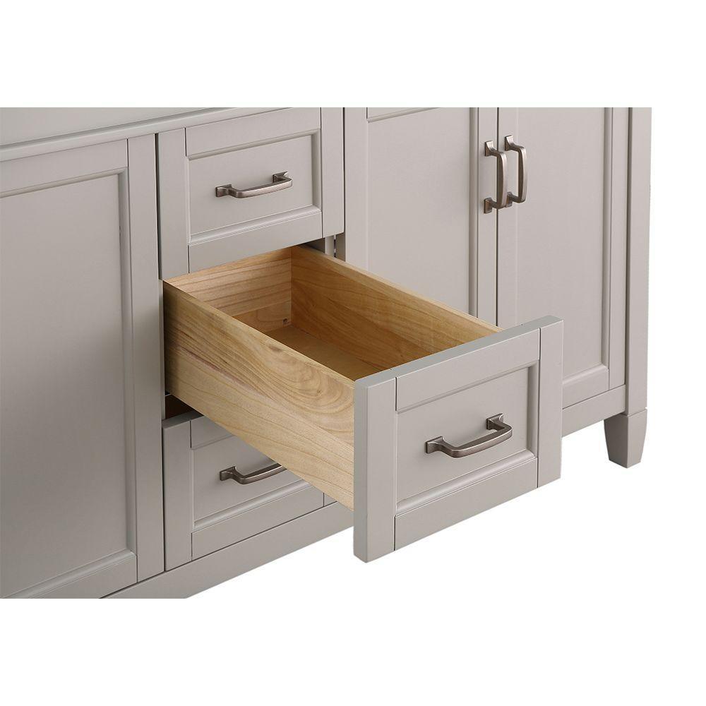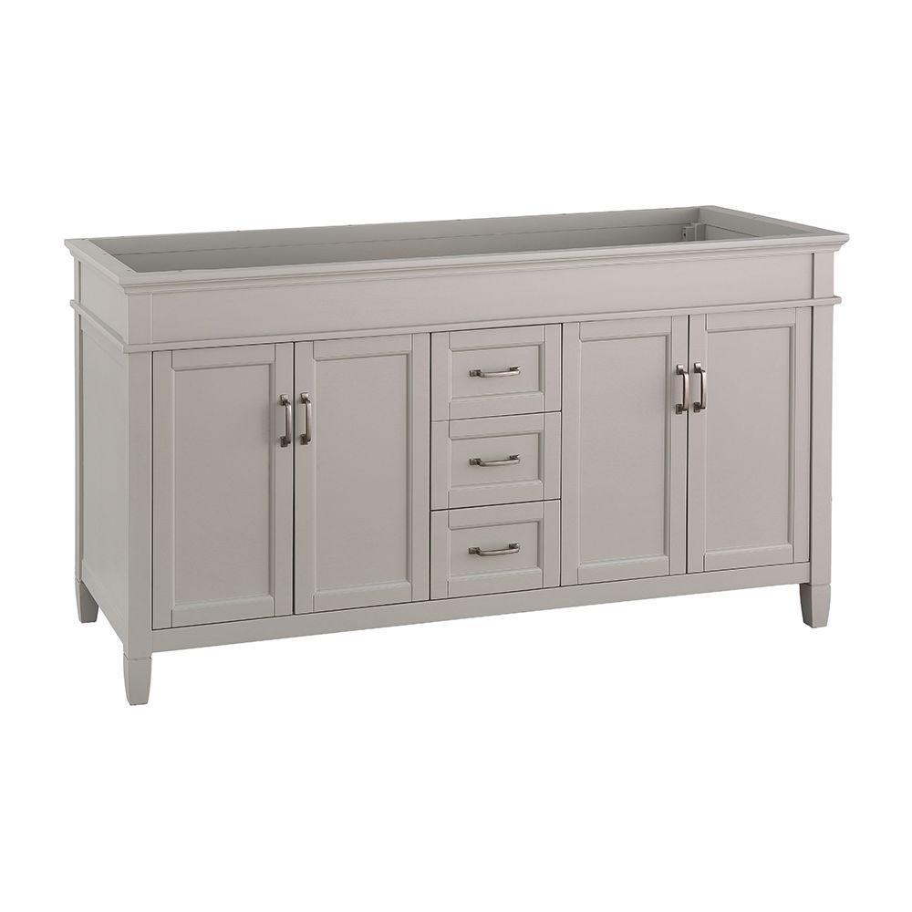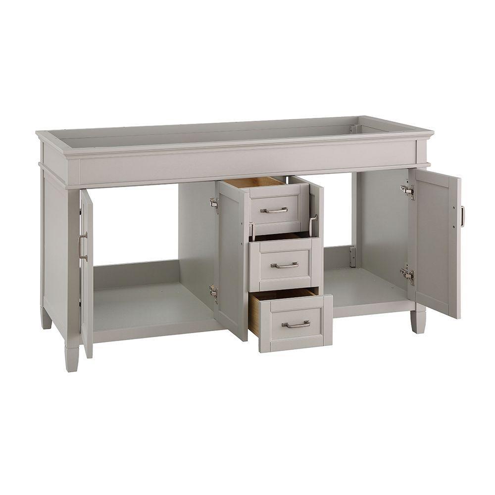 The Ashburn 60 in. bathroom vanity cabinet offers a design that is both decorative and fully functional to complement your decor. This upscale double vanity boasts an understated grey finish and a clean, sleek profile for a modern look. Two sets of double doors with soft-stop bumpers and three middle drawers open up a bevy of storage options for linens and bath essentials, setting the tone for a tidy powder room. The sturdiness and craftsmanship of this vanity cabinet offers a custom look, while small details like leg levelers instill confidence for perfectly stable setups. Pair this vanity cabinet with other items from the Foremost Ashburn collection for a complete bathroom makeover.