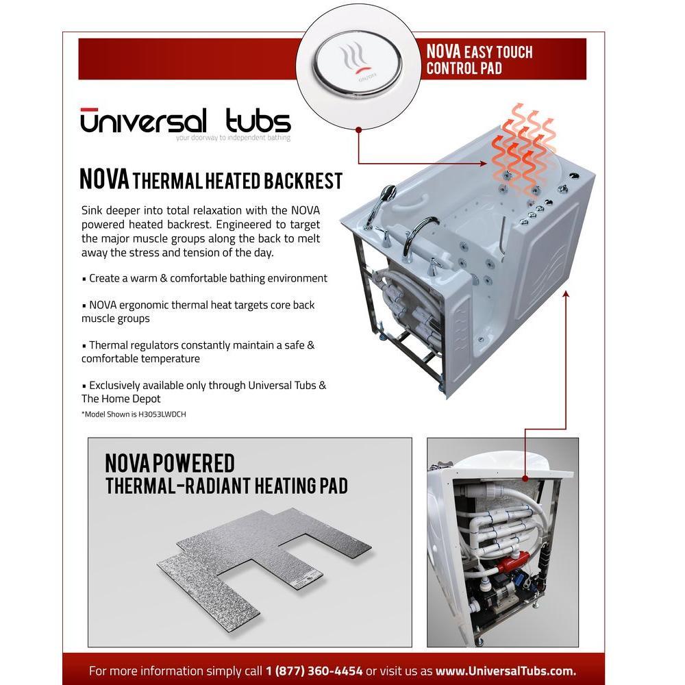 Universal Tubs Wheelchair accessible bathtubs allow for effortless transition from a wheelchair into the specially designed bathtub. Using the latest in bathtub crafting techniques and industrial quality high grade materials Universal Tubs has developed a stunningly beautiful bathtub with unmatched performance and reliability. The built-in ADA compliant features, slip resistant flooring and wide opening door ensure a safe and secure environment granting piece of mind and a worry free bathing experience. The Nova Ergonomically Heated seating creates a pleasantly warm surface which to recline into spreading the soothing warmth all along your back. Reclaim that independence and once again experience the freedom of enjoying a luxurious full body bath whenever you please.