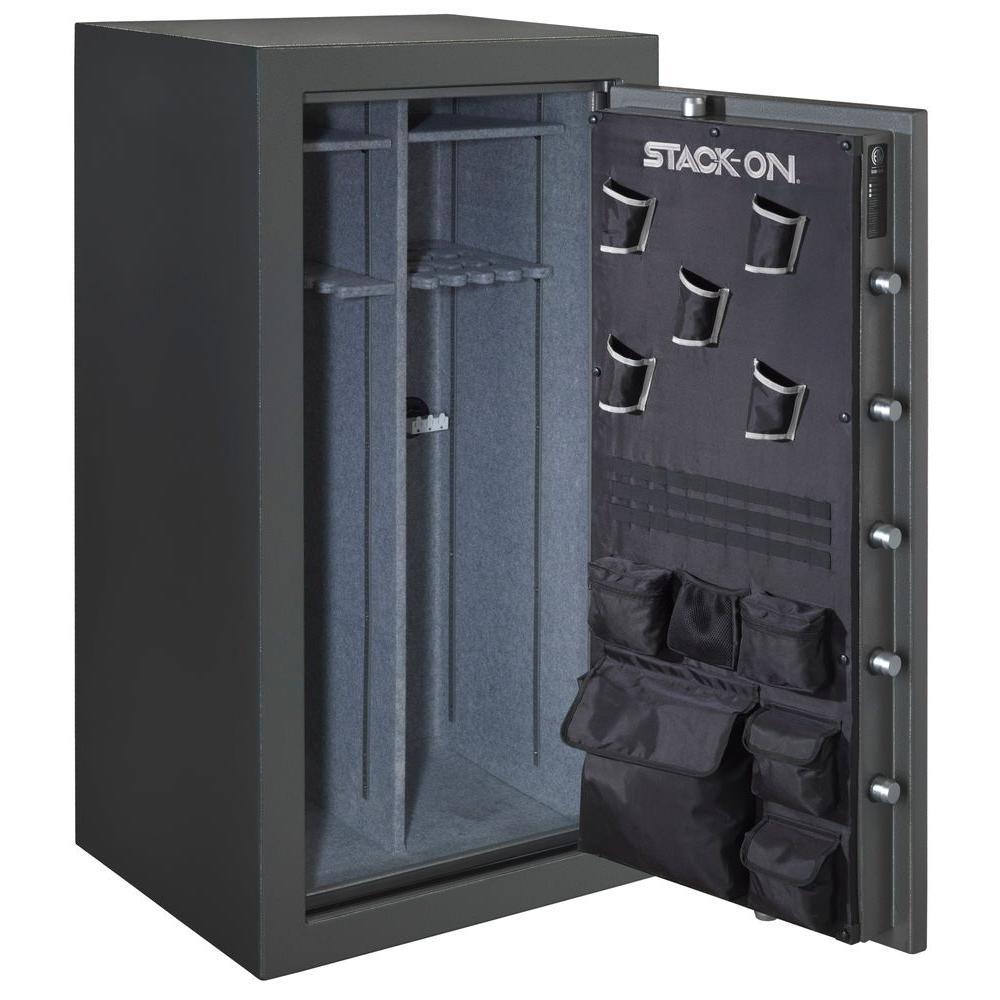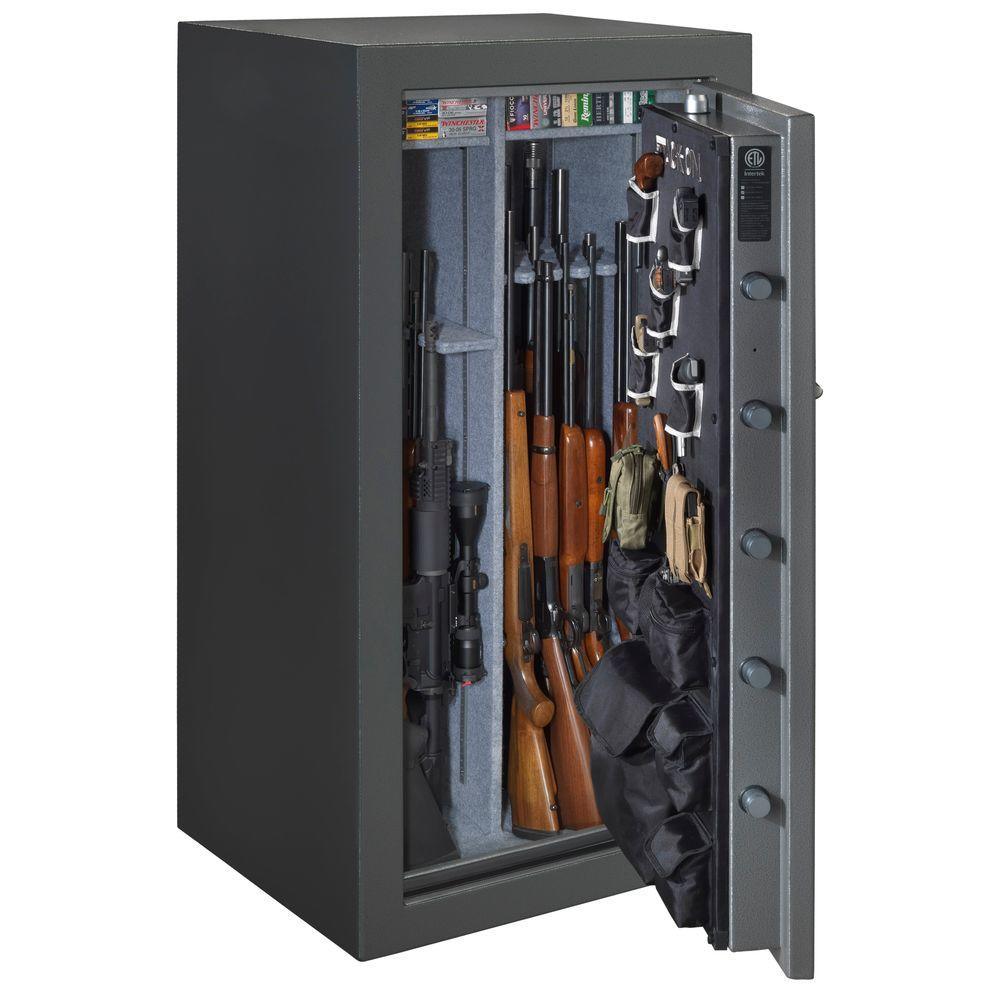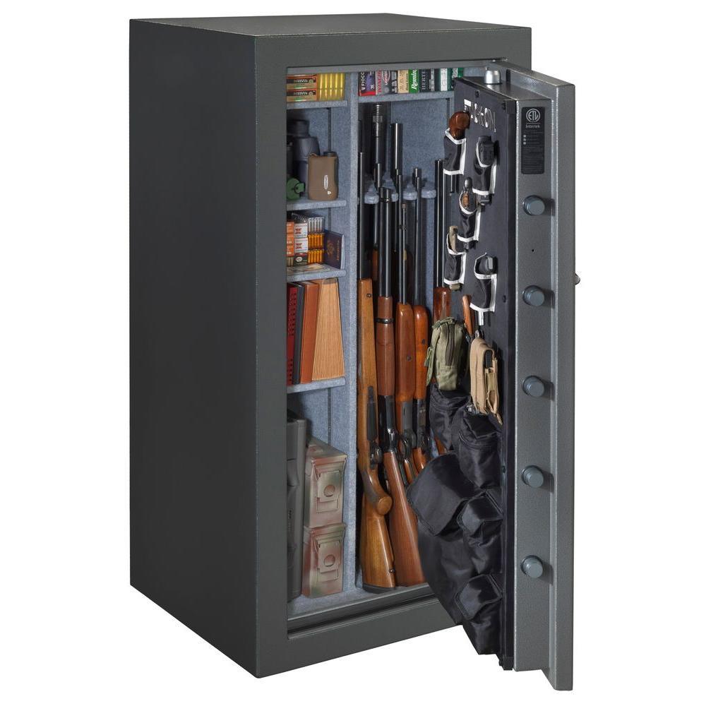 Designed to store MSRs, Ars and long guns, this 40-Gun Fire/Waterproof Combination Lock Safe is the perfect addition to your home. Each Safe features height-adjustable carpeted barrel rests that provide you with plenty of space to safely store your guns. The safe is waterproof in up to 2 ft. of standing water for up to 72 hours and fire resistant up to 1400 degrees F for up to 75 minutes.