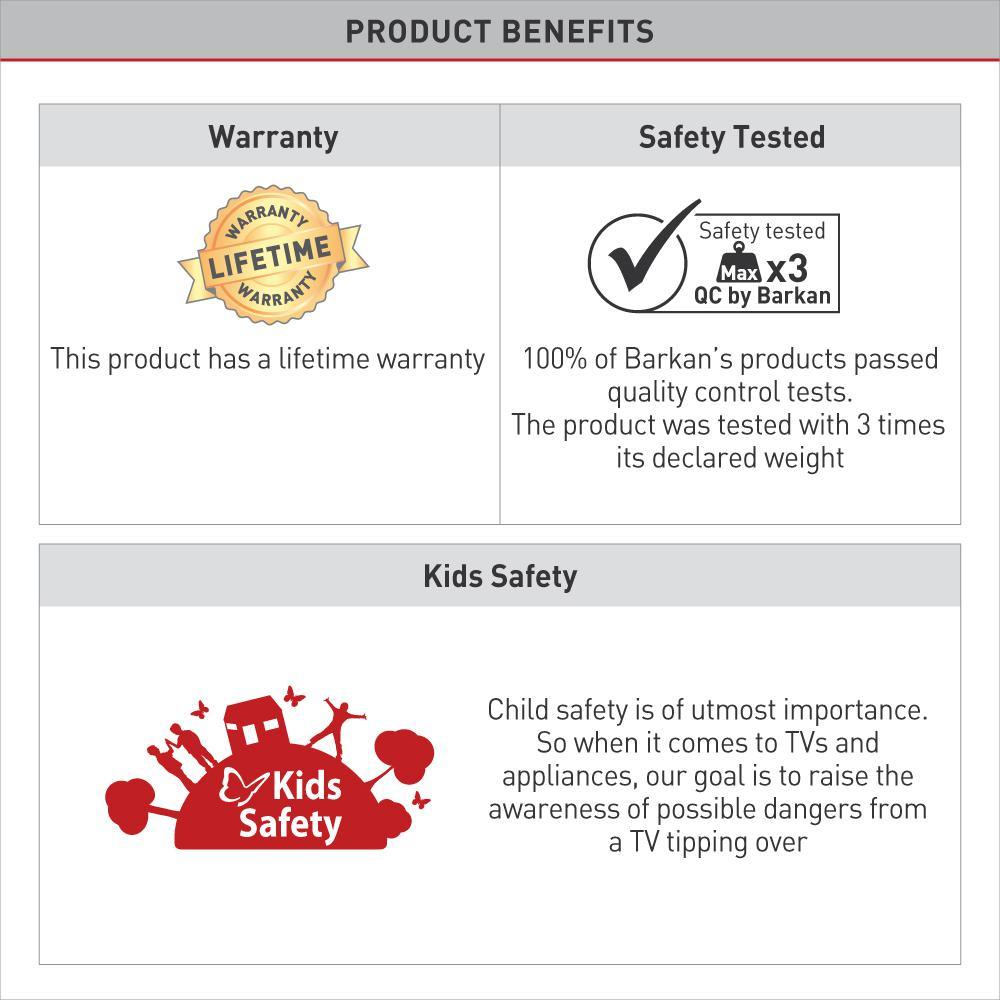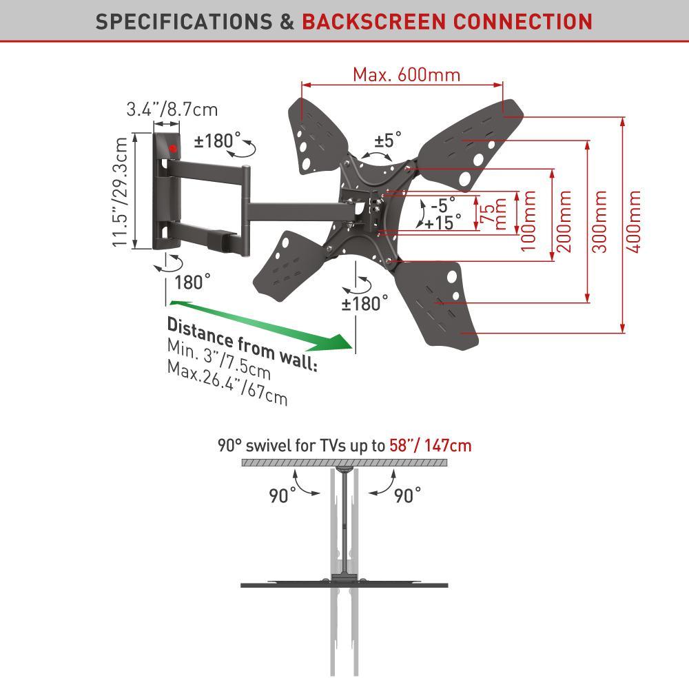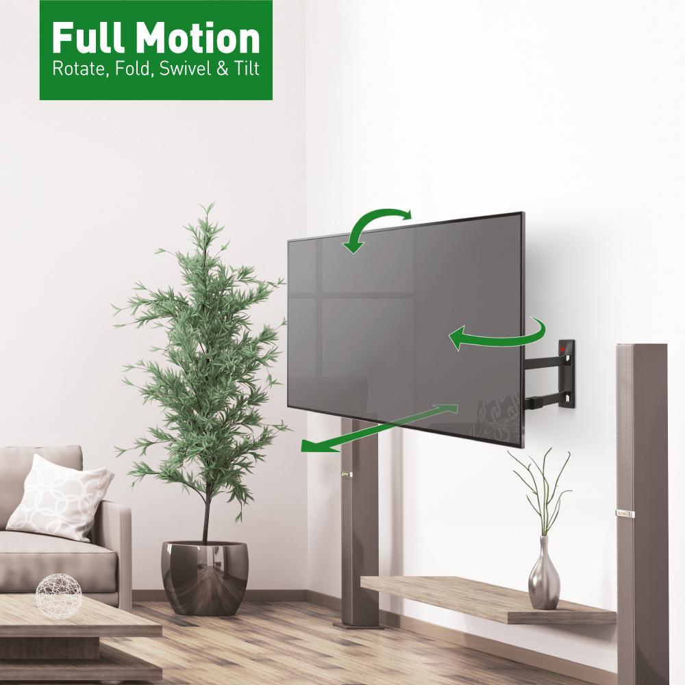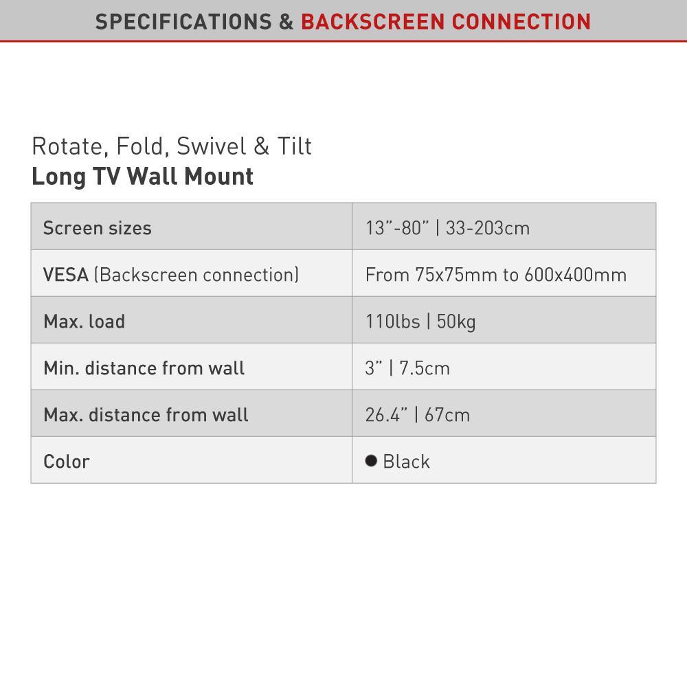 The Barkan full motion, 4 - movement TV mount with rotate, fold, swivel and tilt options fits flat / curved screens sizes 13 - 80 inches and weight up to 110lbs. The minimum distance between the mount and the wall is only 3 in. and the maximum distance is 26.4 in. which allows 90 degree-swivel for screens up to 52 in. (width up to 47.2 in.). It is extremely extendable in open position therefore allows viewing from a variety of places and locating the screen around the corner of a wall. In closed position provides low profile mounting. It fits TVs with VESA standard (Bracket Mounting Holes Patterns) 75x75, 100x100, 100x200, 200x100, 200x200, 300x300, 300x400, 400x200, 400x300, 400x400, 600x400 mm and non VESA up to 600x400 mm. In order to offer a better point of view, the mount has three pivots: near the wall 180 degrees, foldable 360 degrees, swivel near the screen connection plate 180 degrees and also tool free tilt from 0 till 10 degrees. The mount has a lifetime warranty and its color is black. Please check the list of included screen-connection screws in the assembly instructions. If your screen requires different screen-connection screws, please purchase them in your local hardware store or consult us at sales.usa@barkanmounts.com. **If you are satisfied with the product, please leave a review. If you are not satisfied please contact us at https://www.barkanmounts.com/support and we will solve the problem for you**