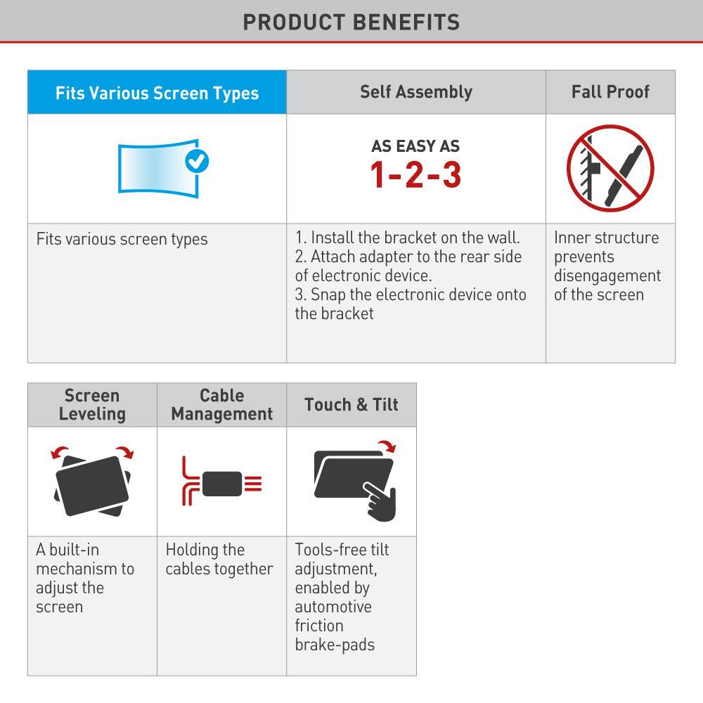 - Self Assembly - 1. Attach adapter to the rear side of electronic device. 2. Install the bracket on the wall. 3. Snap the electronic device onto the bracket.