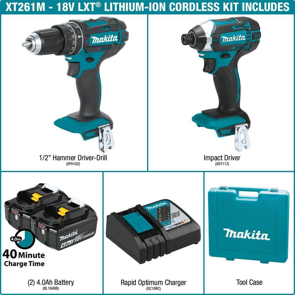 Includes: 18-Volt LXT 1/2 in. hammer driver-drill (XPH10Z), 18-Volt LXT impact driver (XDT11Z), two 18-Volt LXT lithium-ion 4.0Ah batteries (BL1840B), 18-Volt lithium-ion rapid optimum charger (DC18RC), plastic tool case (824812-5)