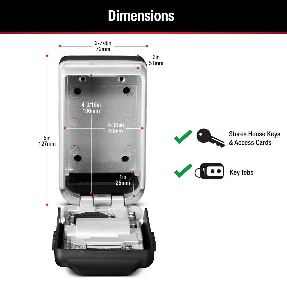 The Master Lock No. 5425D Wall Mount Light-Up Dial Lock Box features a 2-7/8 in. (72 mm) wide metal body for durability. This lock box offers the freedom of controlling access to your property in dark and low-light conditions. The high-contrast, illuminating dials combined with resettable combination functionality provide a secure, easy-to-manage storage location for spare keys and access cards. Easily attach your lock box to a fixed surface and be confident in the strength and reliability of the product you just installed. The Limited lifetime warranty provides peace of mind from a brand you can trust.