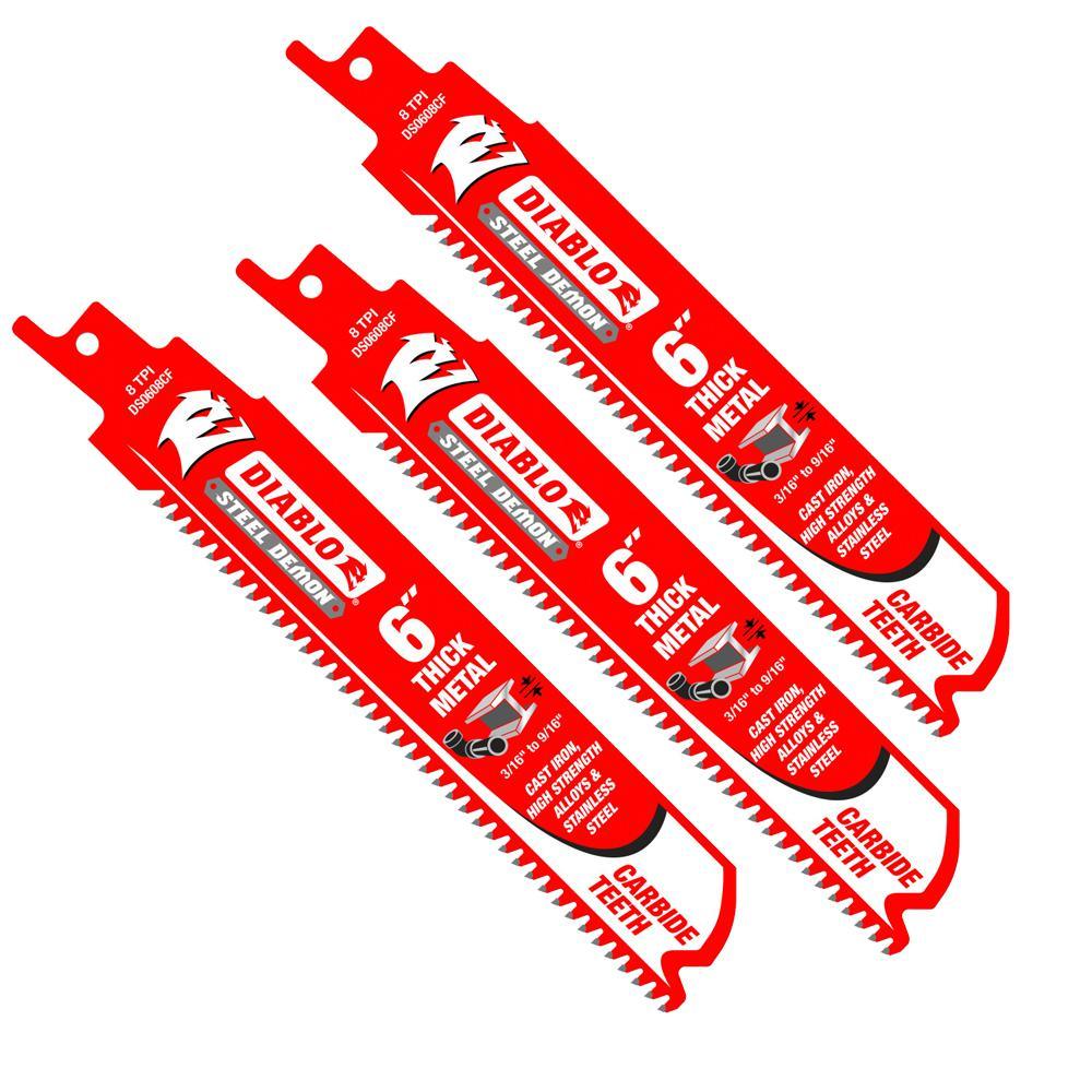 The Diablo Steel Demon Carbide-tipped reciprocating blades are the first carbide-tipped blades designed for extreme metal cutting; including high strength alloys, cast iron and stainless steel. This high performance carbide-tipped blade delivers unmatched 50 times longer cutting life than standard bi-metal blades in extreme thick metal cutting applications between 3/16 in. to 1/2 in. The increased blade body height produces straighter cuts with less vibration. Up to 10% savings when purchasing this 3-piece pack.
