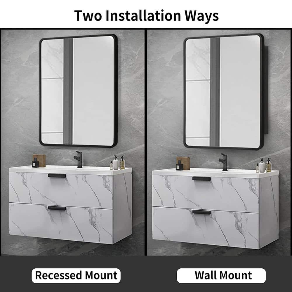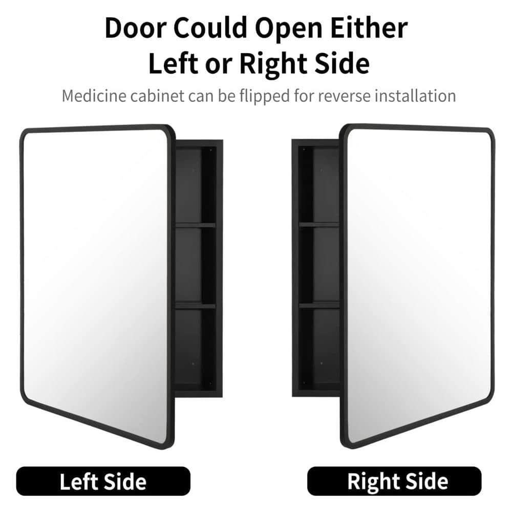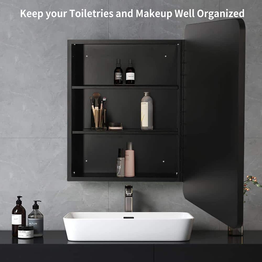 Meet the harmony of form and function with this black metal-framed medicine cabinet. Its sleek aesthetic not only elevates your bathroom's visual appeal but also provides a practical storage solution. The standout feature is its rounded corners, adding a touch of modern elegance to your space. Style it above a minimalist black vanity to create a chic, seamless look. This piece is essential for those who crave luxury in everyday living.